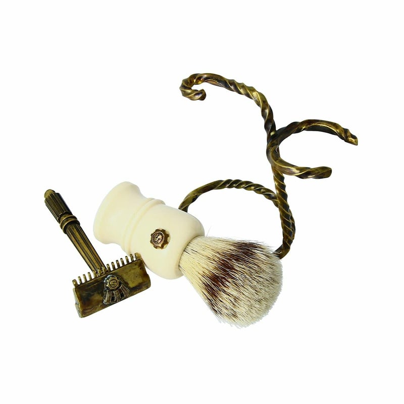 1940年制の髭剃りとブラシが登場。それぞれ別々で売られていたところをたまたま発見し、購入。またスタンド台はオリジナルでハンドメイドで作製している。