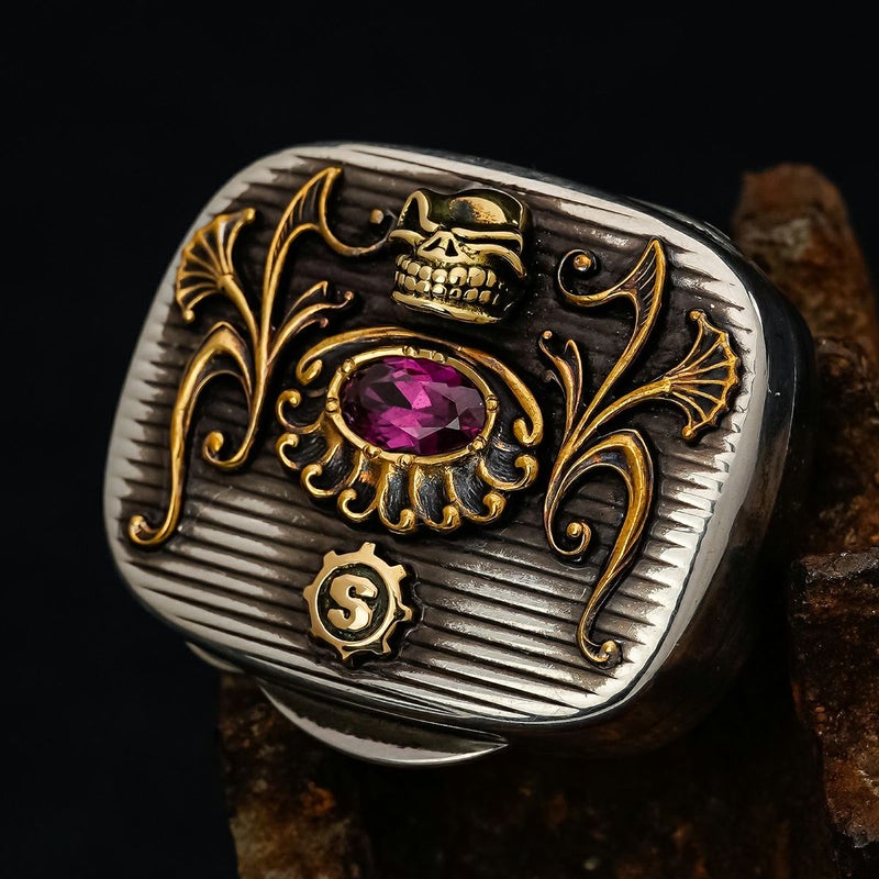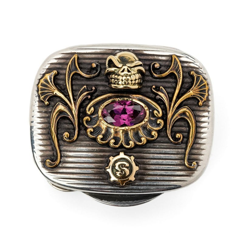 ティファニー本来が持つオリジナルの良さを活かしつつ、他のアンティークパーツとスターリンギアオリジナルパーツを組み合わせ関せされた究極の一品。小さいスカルとSギアロゴは18金で、更にセンターパーツのアンティークにはジェムジュエラーが原石から削り出したロードライトガーネットがセッティングされている。
