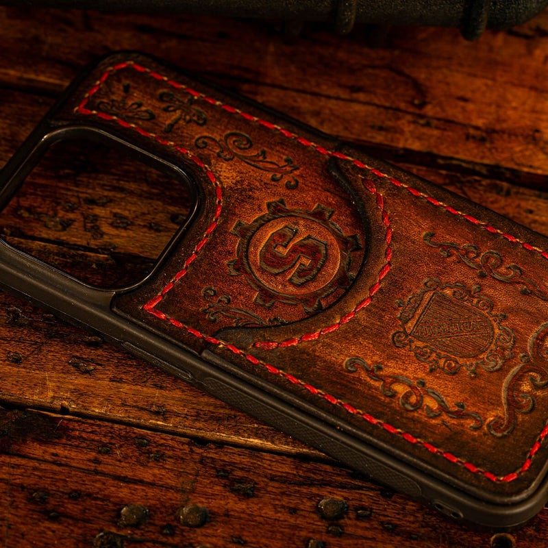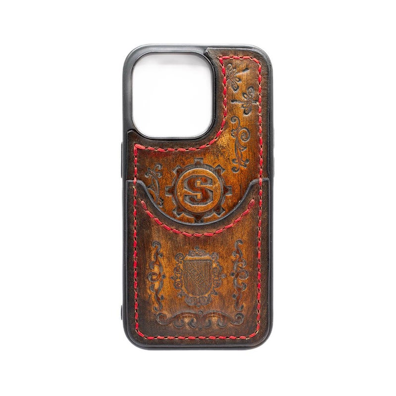 【カスタム】 スターリンギア ワンオフニューレザーフォンケースw/ポケット&マルチエンボス ブラウン s000117270(iPhone14Pro対応)