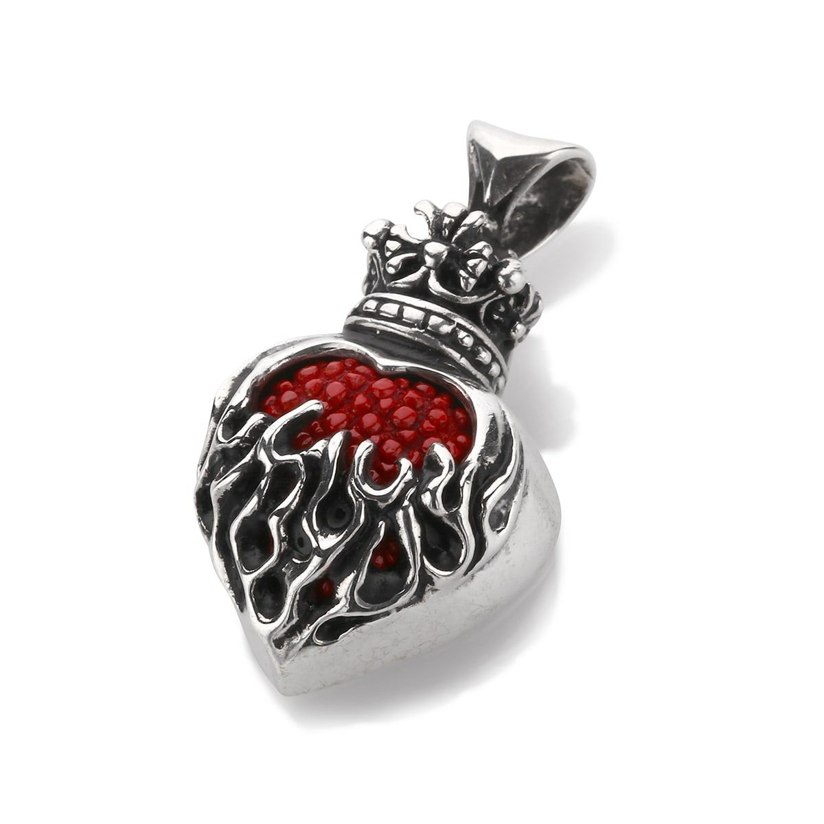 キリストの燃え上がる聖心を題材にデザインされたハートに、王冠を組み合わせたオリジナルのデザイン。中央には色鮮やかな赤色のスティングレイレザーを組み合わせることで、着用時のアクセントとして際立つように仕上げられている。