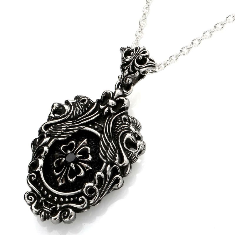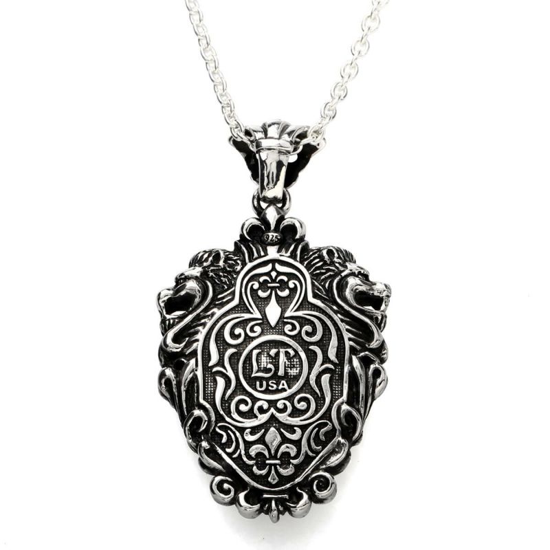 ウォッチバンド(ライオン)をベースにしたペンダントになります。ゴシック調で尚且つアンティークな雰囲気をわせる仕上がりです。『インレイワーク』『パズルのような構造』を取り入れ、手に取った際の質量感、重み、そして感性をくすぐるようなバランス感を重視しています。レザーズ&トレジャーズを象徴するボリューム感、そしてゴシックのデザイン、さらにインレイパーツ、レザーインレイの良さを十二分に盛り込んだペンダントです。