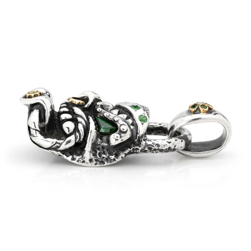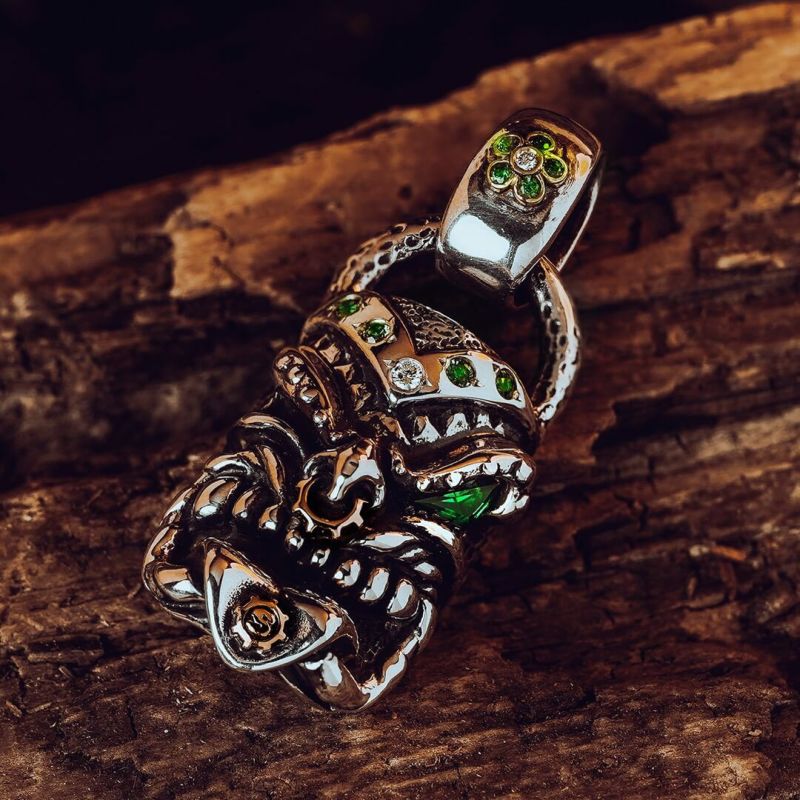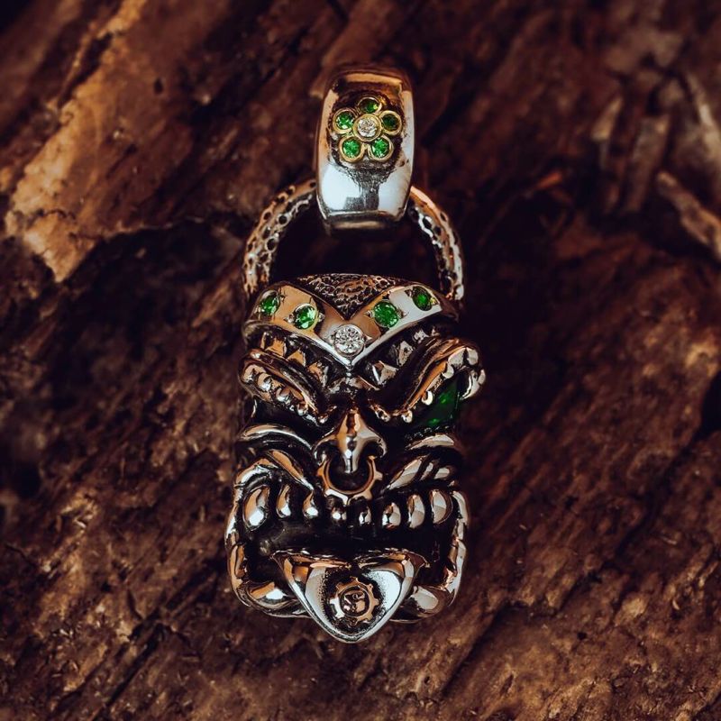 前モデルにも引けを取らない迫力ある大きさで、圧倒的な存在感を持つニューマオリフェイスペンダントは、鼻に22金ゴールドのギアが、舌先とバチカンには18金イエローゴールドのSギアロゴとアンティークパーツが、更にはジュエムジュエラーのZAVAが原石からカットしたハイクオリティのクロームトルマリンが目にセッティングされ、額とバチカンにはダイヤモンドとサボライト(グリーンガーネット)がセッティングされた極上の一品だ。