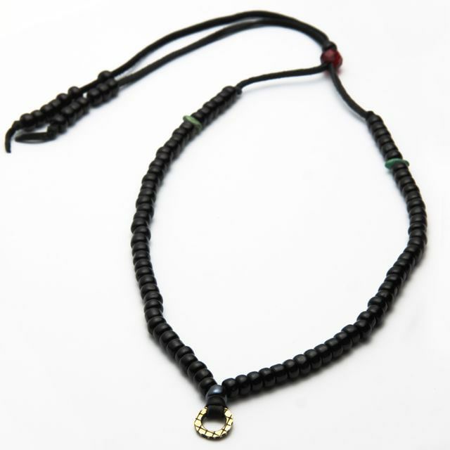 格子柄(フェンス柄)のブラスパーツをトップにシンプルながらこれでもかと言う程、黒ガラスビーズを通したレザーネックレス。アクセントはカラークリスタル風のビーズをストッパービーズに使用し、後ろから数えて7番目のビーズがターコイズになっています。7番目がターコイズだったり、首後ろに垂れるビーズも7個だったり、縁起的にも良しなアイテム。サングラスホルダーとして使用するのも◎。