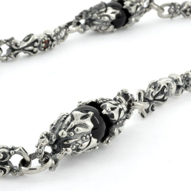 オニキスの珠をシルバーで挟み込み、間のパーツには石の入った贅沢なネックレス。ガーネット・アメジスト・スモーキークォーツの3種類から選択できます