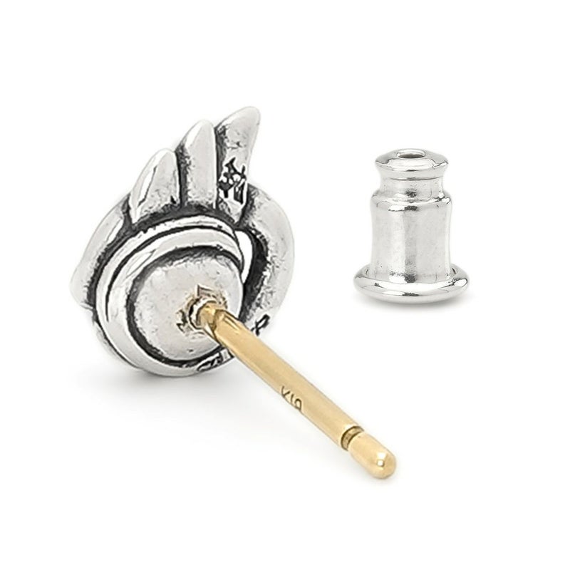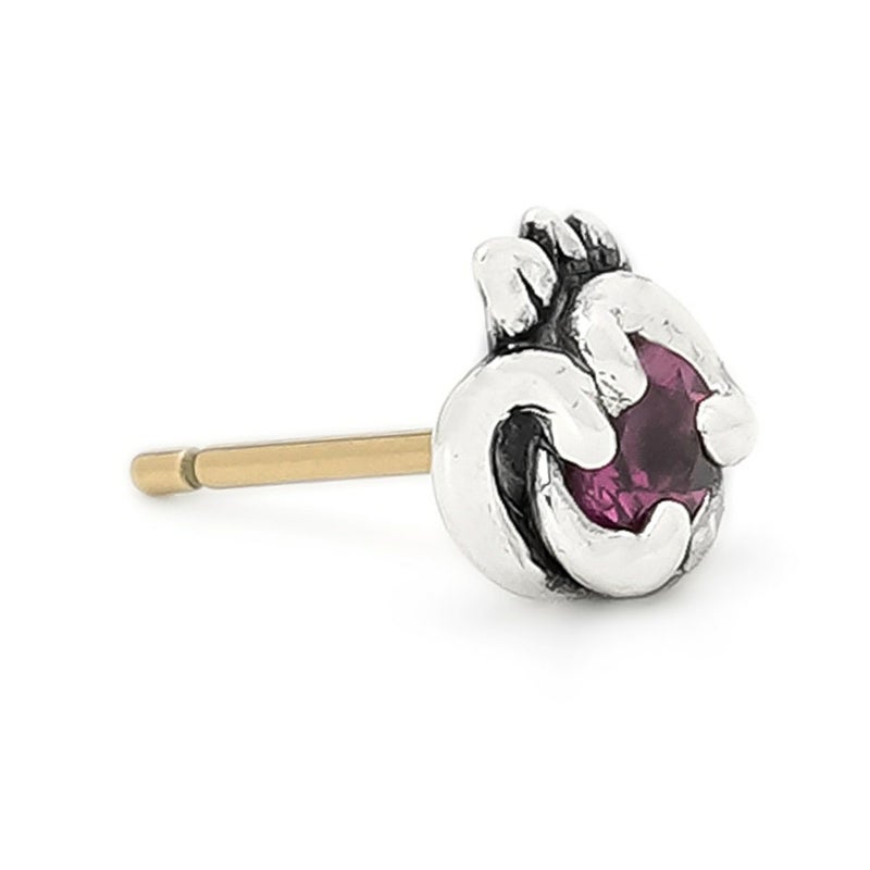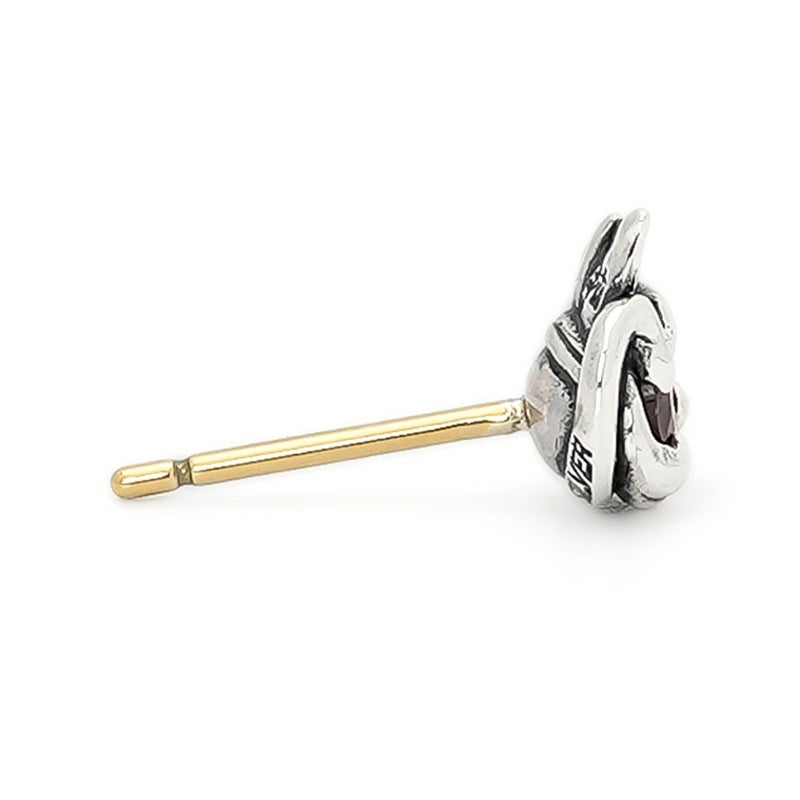 ロードライトガーネットをヒクイドリの目に見立てたピアス。火食い鳥イヤーフックと組み合わせると、命の火が灯ったようにような表情になります。