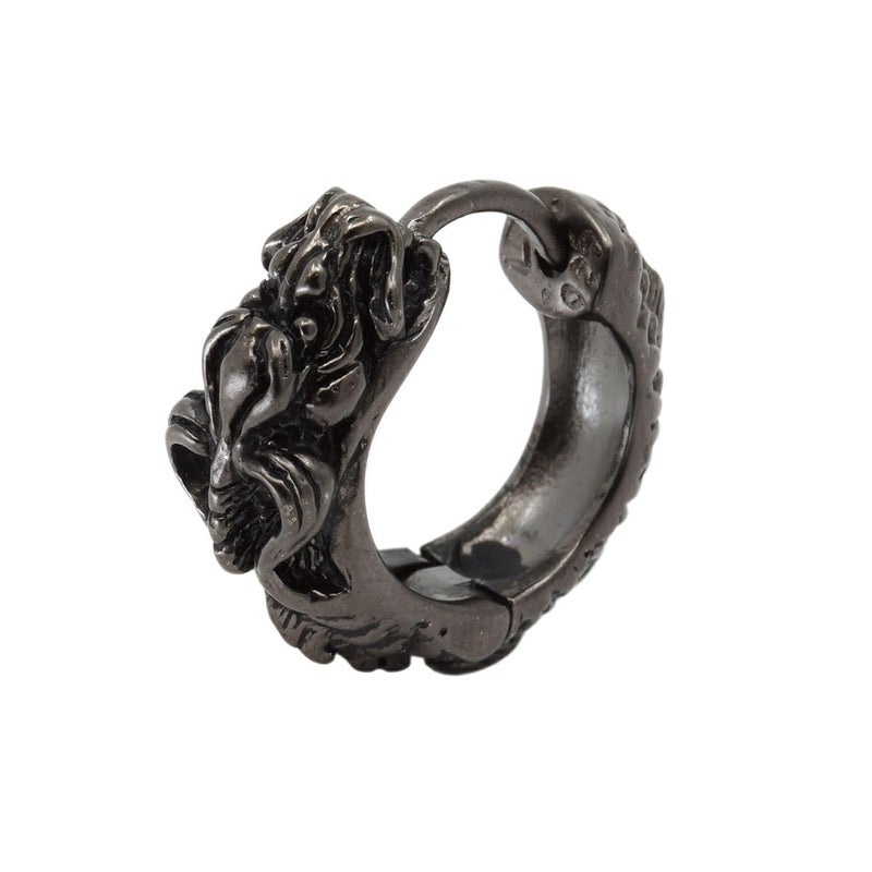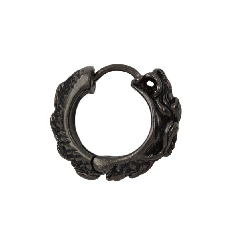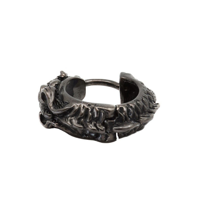 小振りのボディーにドラゴンのリアルな姿を表現した、キャッチのないフープ型ピアス。コントラストのあるブラック仕様は、使い込むことでその存在感を引き立たせてくれる。