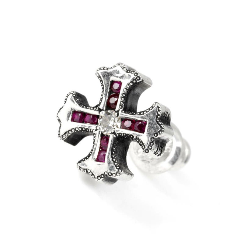 大航海時代のスペインで用いられた、王族海軍の十字架をモチーフにしたピアス。縦横に留められたダイヤモンドとルビーの輝きは、眩い輝きと存在感を与えてくれます。