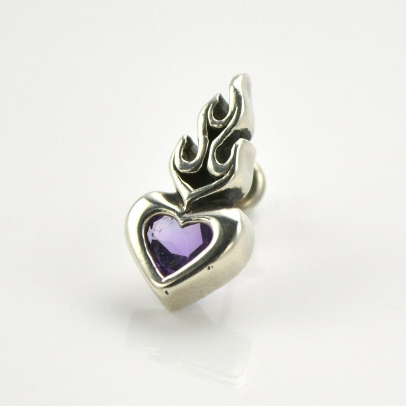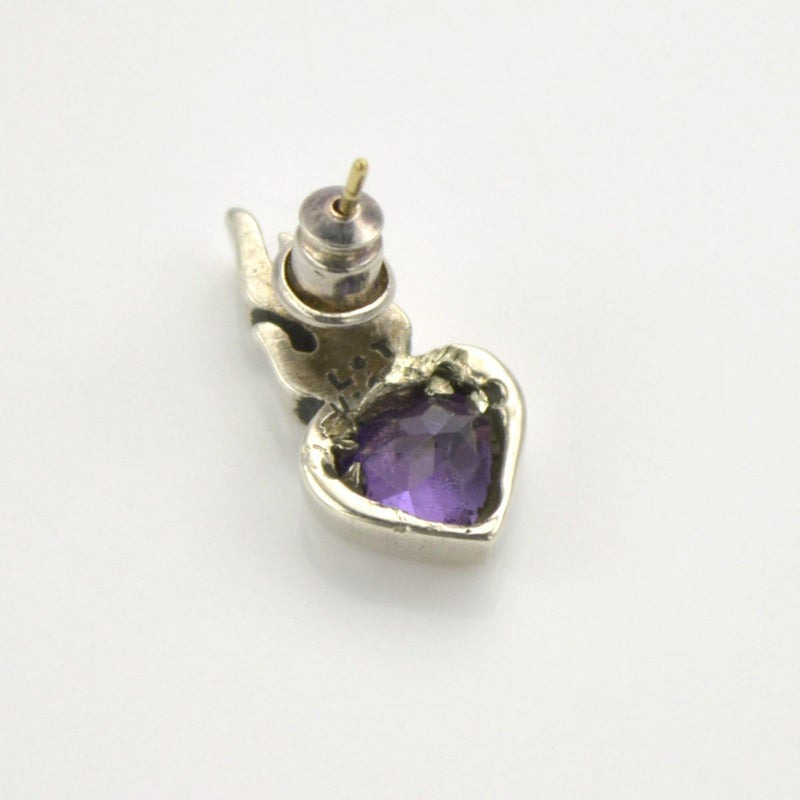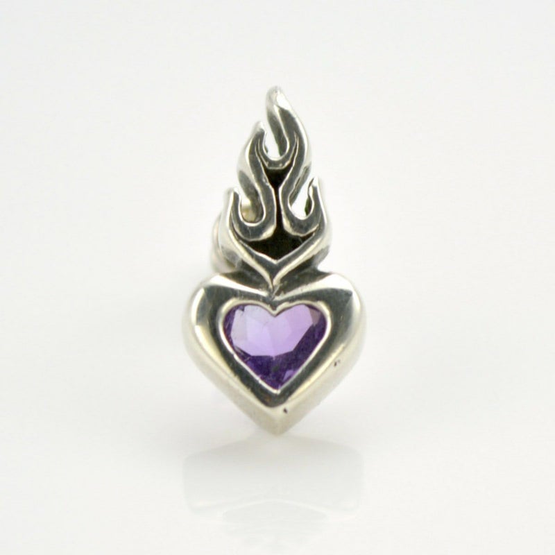 キリストの聖なる心と燃え上がる信仰心を表現した、ブランドを代表するモチーフのピアス。中央にはアクセントとなるアメシストが留められており、ミステリアスで落ち着いた雰囲気を引き立たせてくれる。