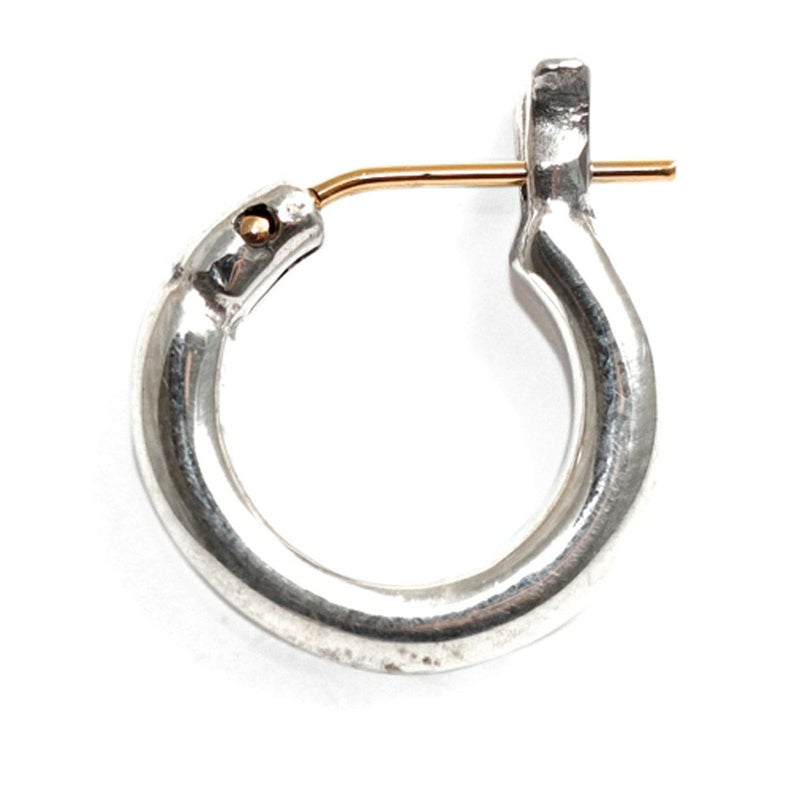 耳たぶを包み込む様な丁度良い着用感の定番フープピアス(S)の3mm肉厚ボディタイプです。ピアスの針の部分が可動する開閉式のピアスで、この開閉式により、ピアスのキャッチを紛失する不安が解消されました。ピアスの根元辺りに1本ラインがカービングされただけの、シンプルなデザインで、どなたにも、どんなシチュエーションでもコーディネートしやすいシンプルデザインのフープピアスです。