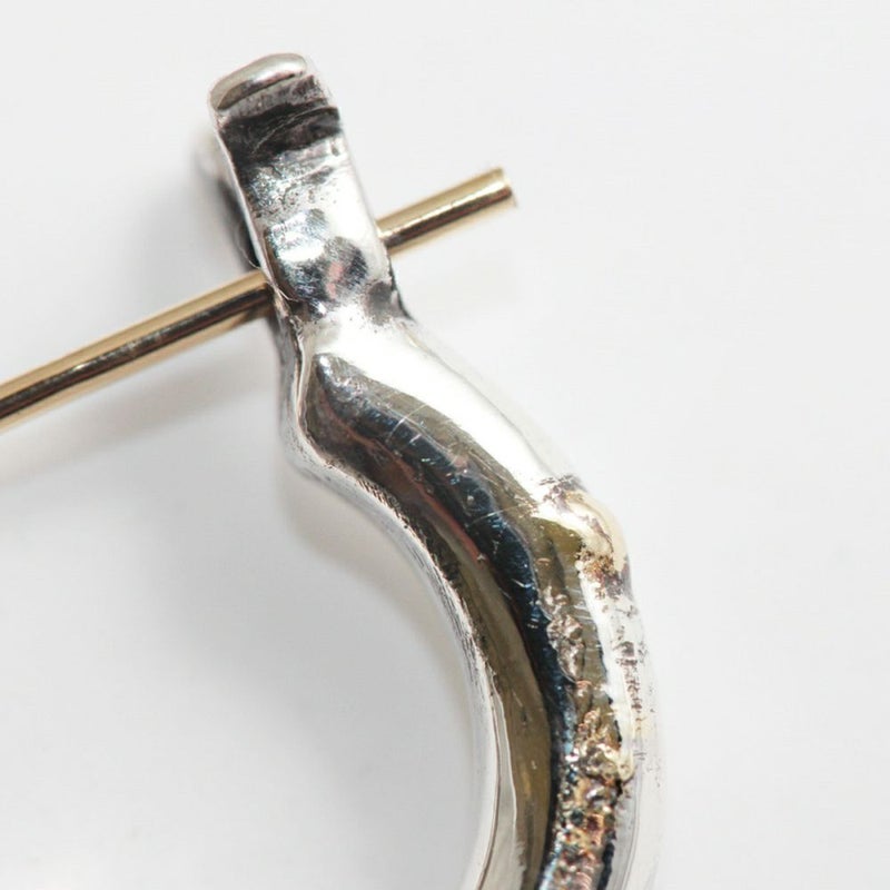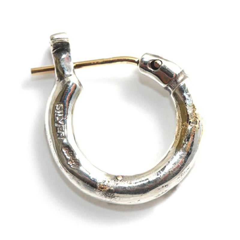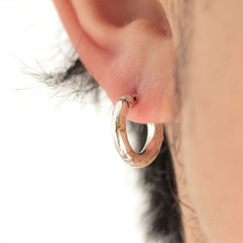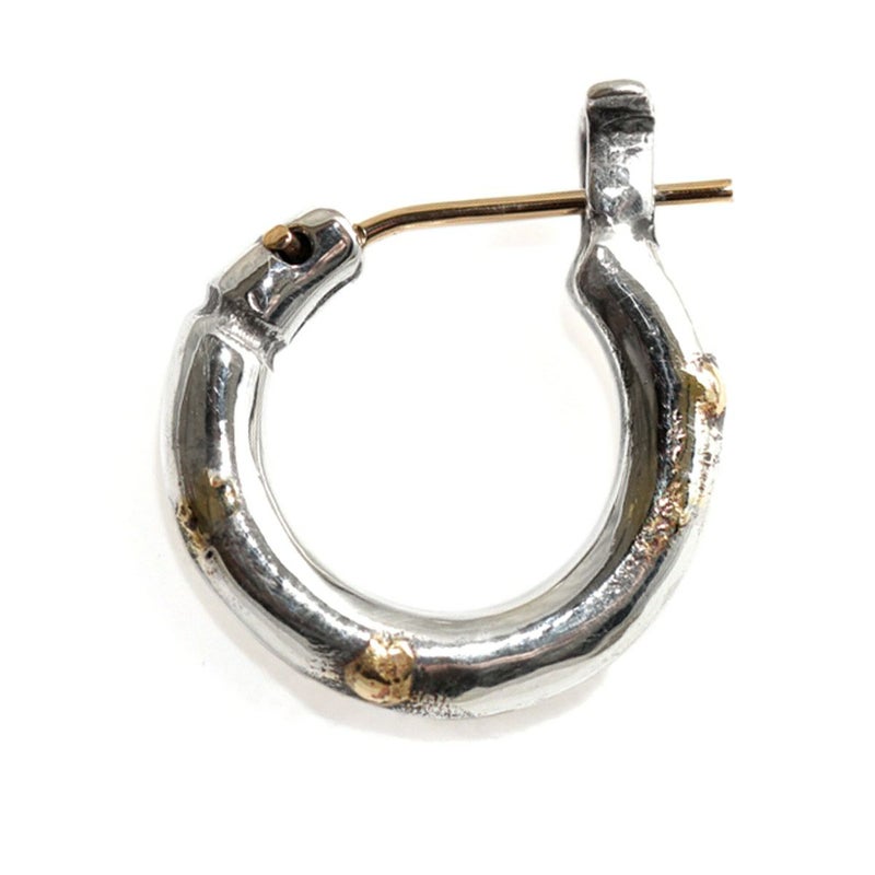 耳たぶを包み込む様な丁度良い着用感の定番フープピアス(S)の3mm肉厚ボディタイプです。ピアスの針の部分が可動する開閉式のピアスで、この開閉式により、ピアスのキャッチを紛失する不安が解消されました。ピアスの根元辺りに1本ラインがカービングされただけの、シンプルなデザインで、ランダムに金鑞を数カ所付着させたアクセントのゴールドの粒がラグジュアリーな土臭さを演出します。どなたにも、どんなシチュエーションでもコーディネートしやすいシンプルデザインのフープピアスです。