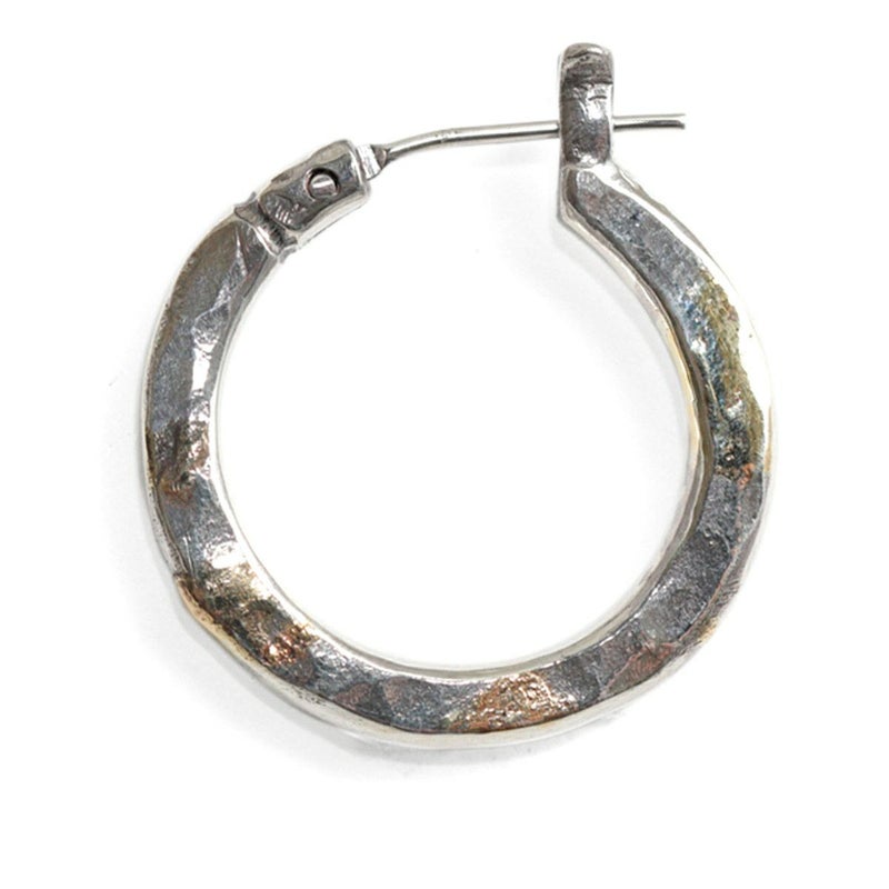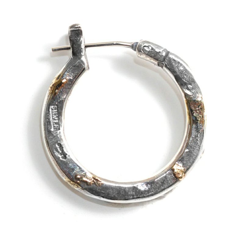 定番フープピアスの3mm肉厚ボディタイプです。ピアスの針の部分が可動する開閉式のピアスで、この開閉式により、ピアスのキャッチを紛失する不安が解消されました。ピアスの根元辺りに1本ラインがカービングされただけの、シンプルなデザインで、ランダムに金鑞を数カ所付着させたアクセントのゴールドの粒がラグジュアリーな土臭さを演出し、ハンマーで叩いた槌目の風合いがなんとも味わいのあるフープピアスです。