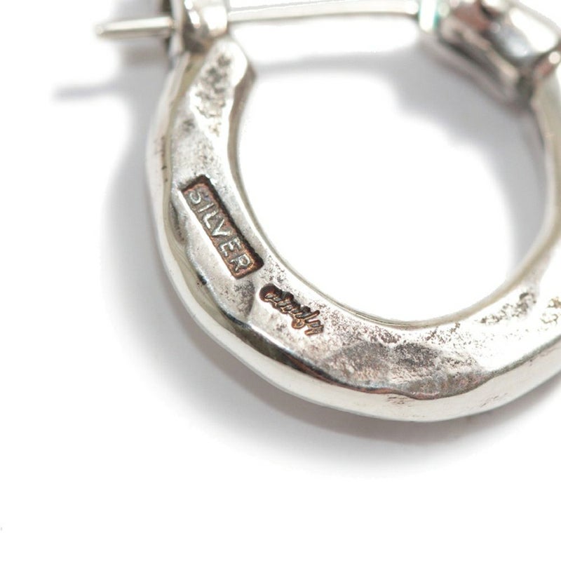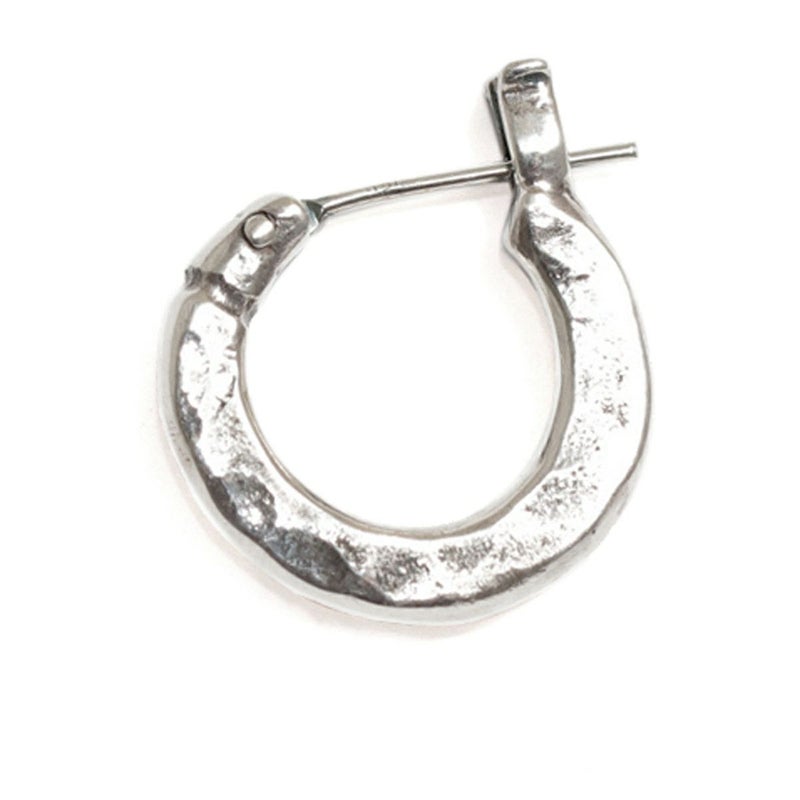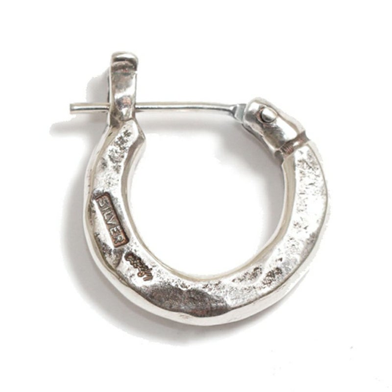 耳たぶを包み込む様な丁度良い着用感の定番フープピアス(S)の3mm肉厚ボディタイプです。ピアスの針の部分が可動する開閉式のピアスで、この開閉式により、ピアスのキャッチを紛失する不安が解消されました。ピアスの根元辺りに1本ラインがカービングされただけの、シンプルなデザインで、ハンマーで叩いた槌目の風合いがなんとも味わいのあるフープピアスです。