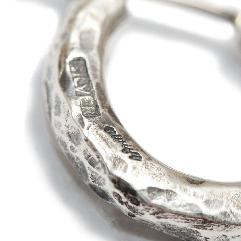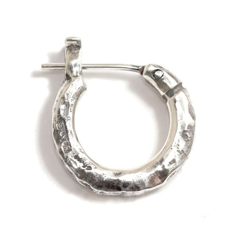 耳たぶを包み込む様な丁度良い着用感の定番フープピアス(S)の3mm肉厚ボディタイプです。ピアスの針の部分が可動する開閉式のピアスで、この開閉式により、ピアスのキャッチを紛失する不安が解消されました。ピアスの根元辺りに1本ラインがカービングされただけの、シンプルなデザインで、ハンマーで正面、側面の3面叩いてますので、正面からの見た目にも無骨さがあるフープピアスです。