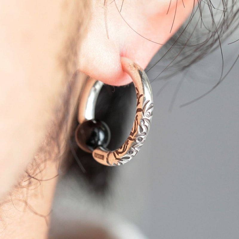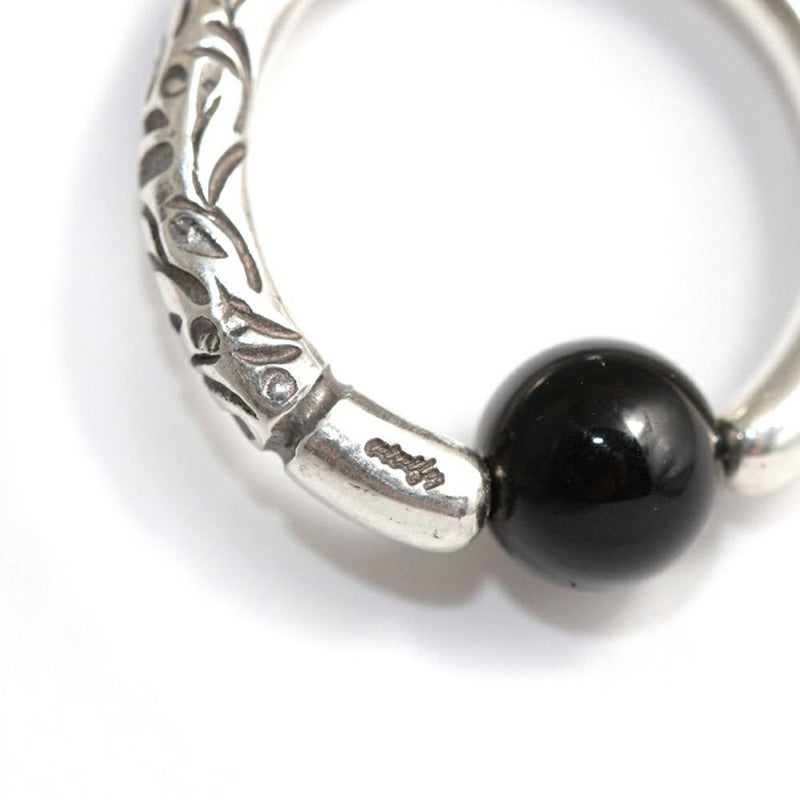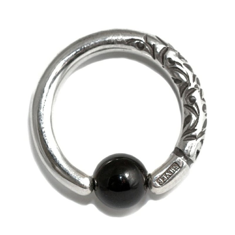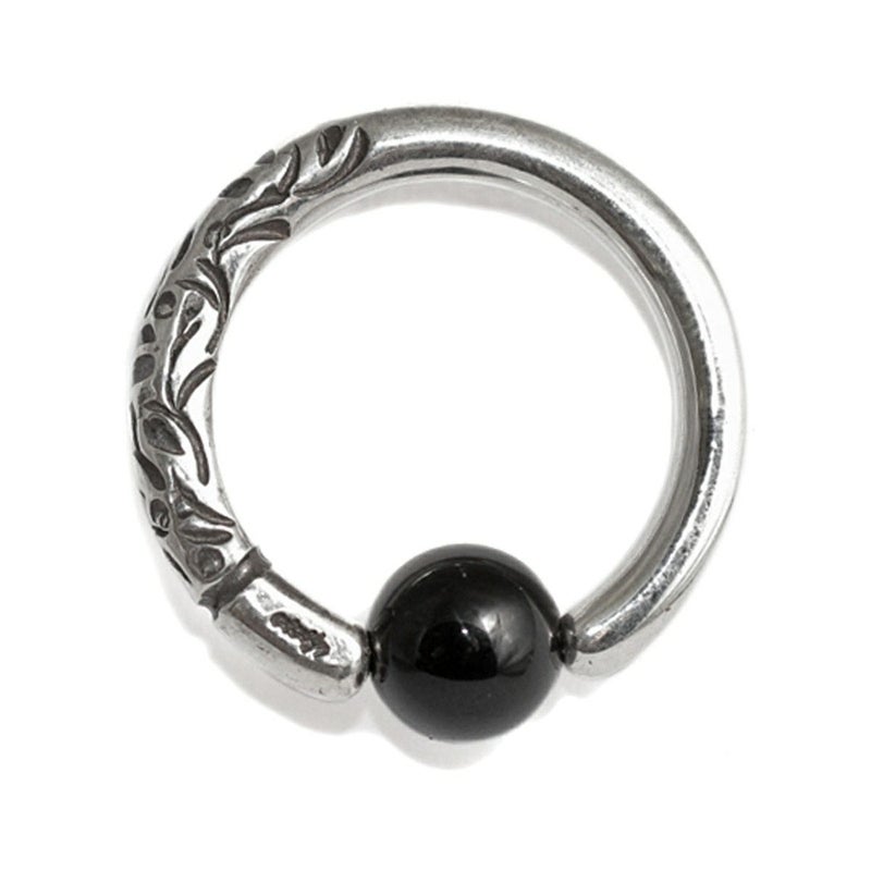 アラベスク(唐草模様)が施されたキャプティブビーズリングボディピアスです。模様を1つ1つタガネで刻印してますので、個体差があり、同じ物は2つとない特別感のあるボディピアスです。ボールには天然石のオニキス/6mmを使用しています。約9~8ゲージ/太さ約3mmのボディピアスです。