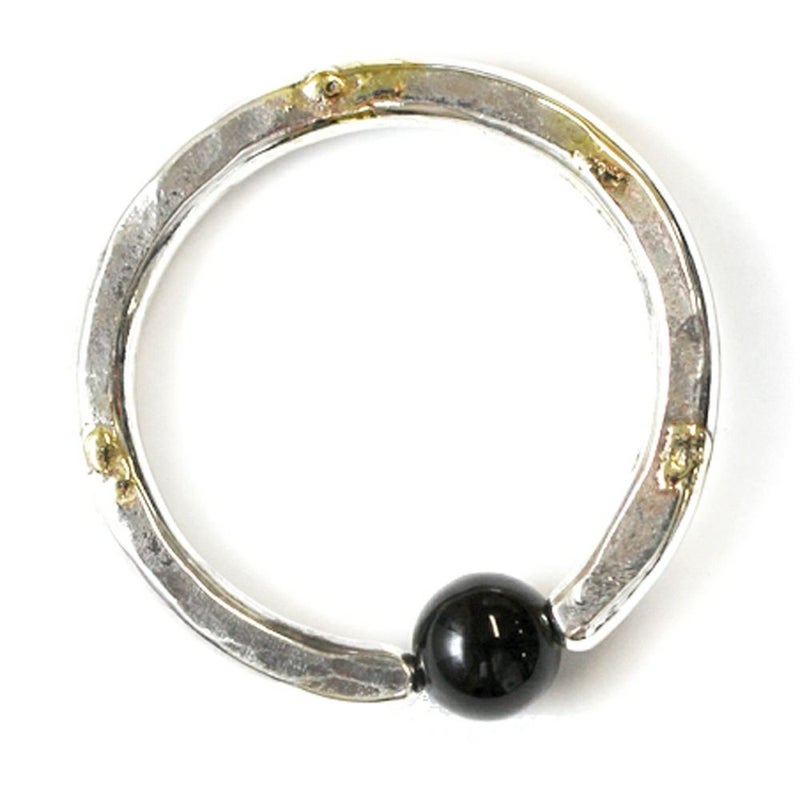 ハンマーで叩いた槌目の風合いが味わいのあるキャプティブビーズリングボディピアス。ボールには天然石のオニキス(4mm)を使用しています。ランダムに金鑞を数カ所付着させたアクセントのゴールドの粒がラグジュアリーな土臭さを演出します。