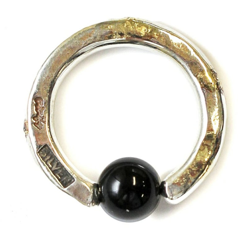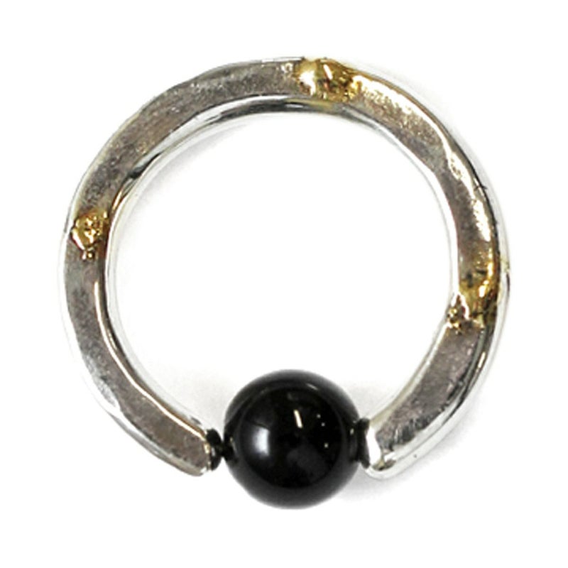 ハンマーで叩いた槌目の風合いが味わいのあるキャプティブビーズリングボディピアス(S)。ボールには天然石のオニキス(4mm)を使用しています。ランダムに金鑞を数カ所付着させたアクセントのゴールドの粒がラグジュアリーな土臭さを演出します。