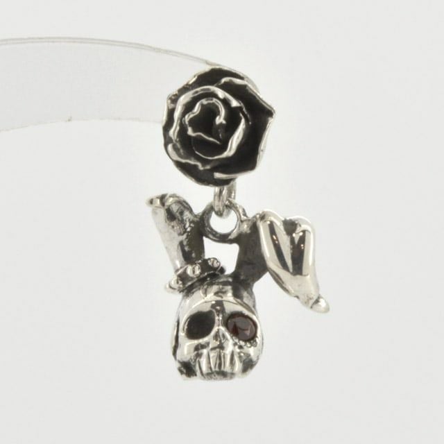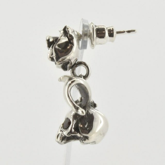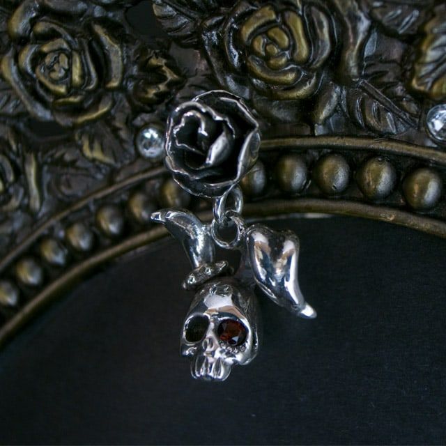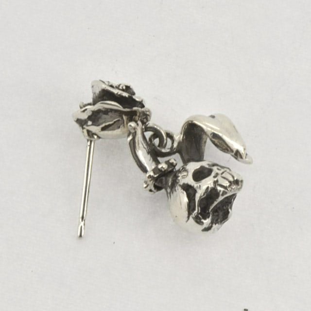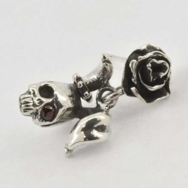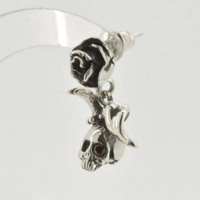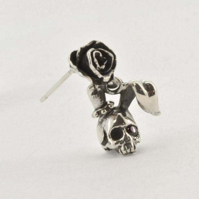 立体的な薔薇パーツと左目にガーネットの入ったウサギスカルの揺れるピアス