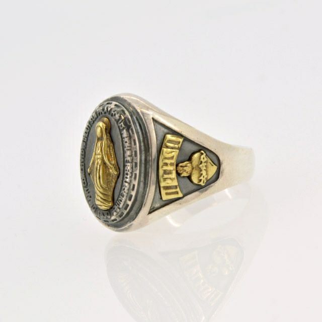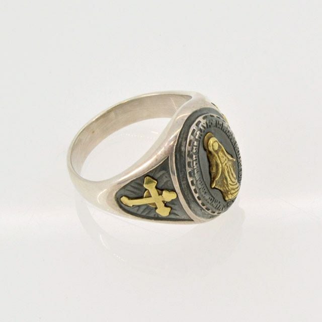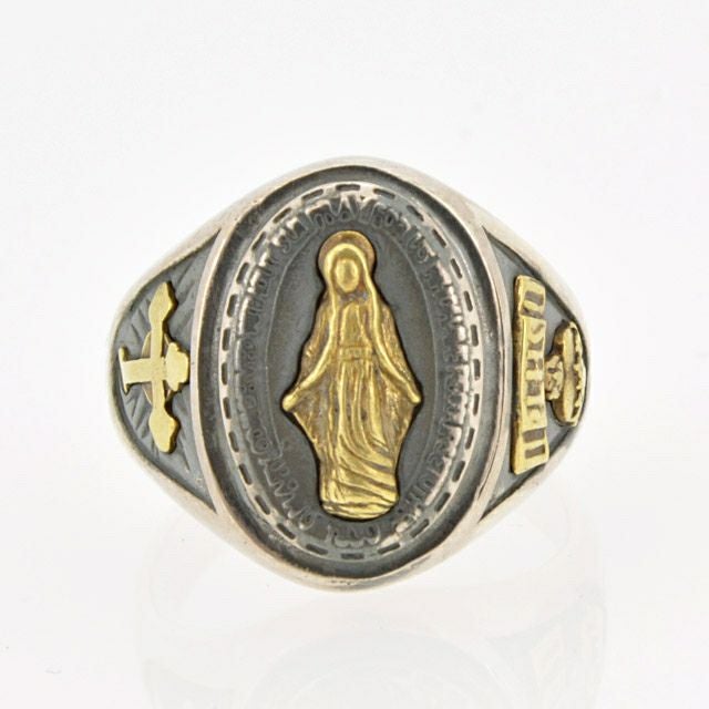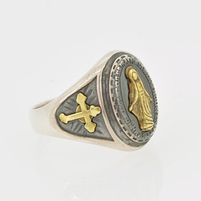 リングの中央に真鍮製マリアを配し両サイドにはマリアに縁のあるシンボルを組み合わせました。