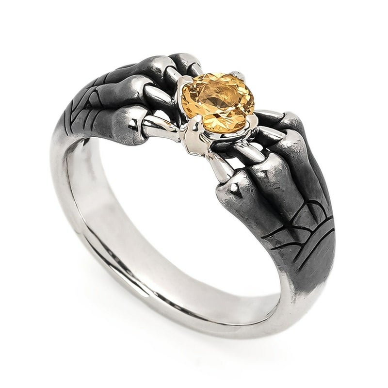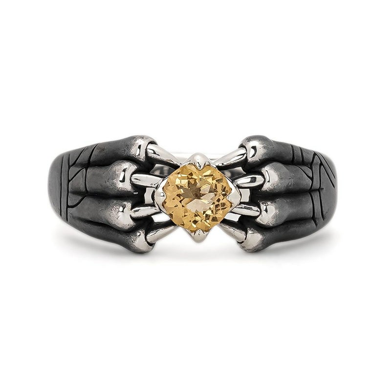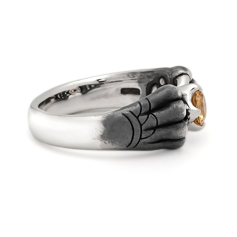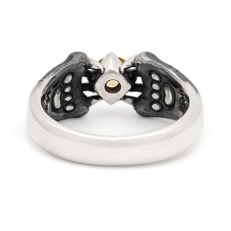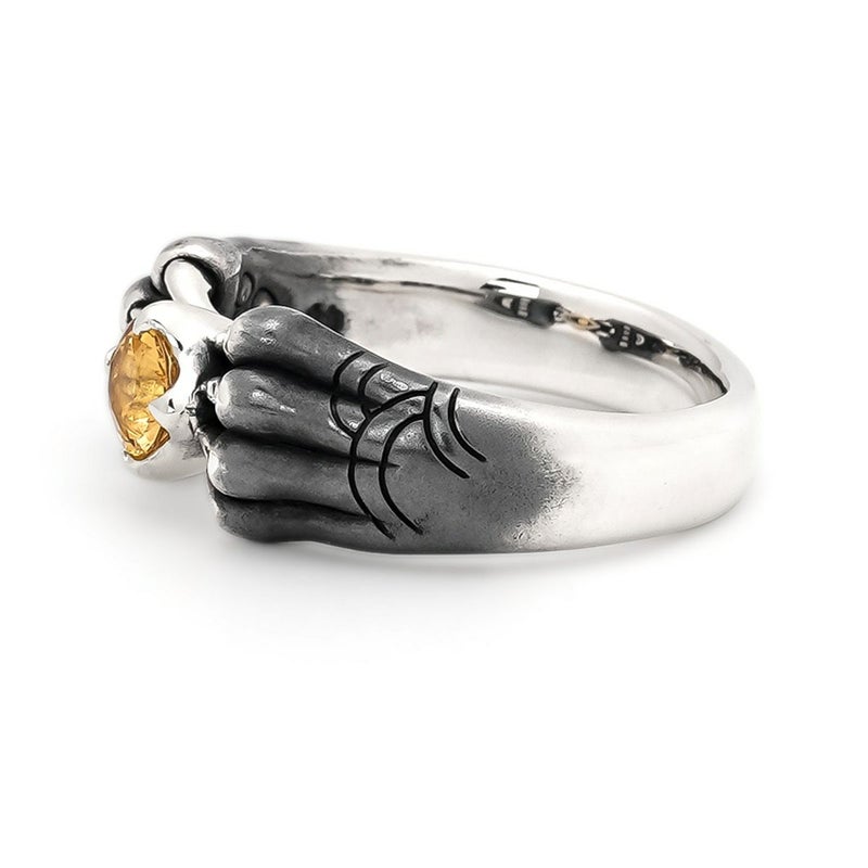 中央に大粒のインペリアルトパーズを配したリング。岩の影から生まれた宝石を守る幻影は、裏側に肉球があり猫科の前足のような風貌。
