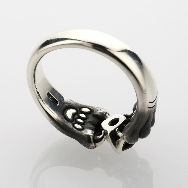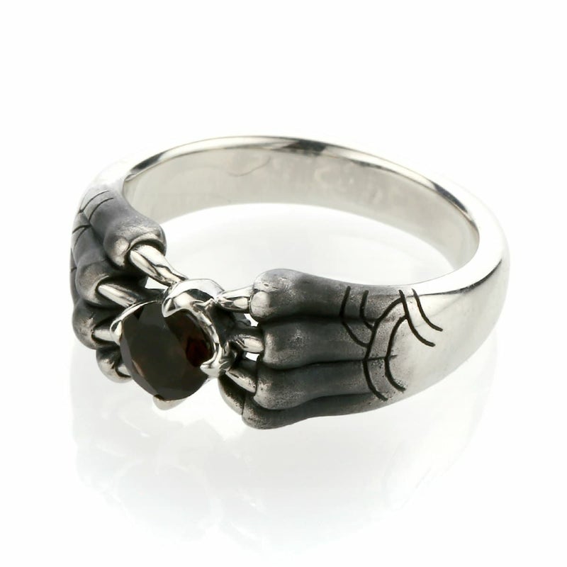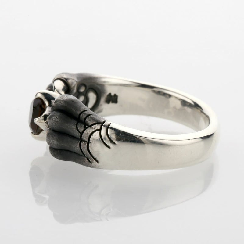 中央に大粒のスモーキークォーツを配したリング。岩の影から生まれた宝石を守る幻影は、裏側に肉球があり猫科の前足のような風貌。