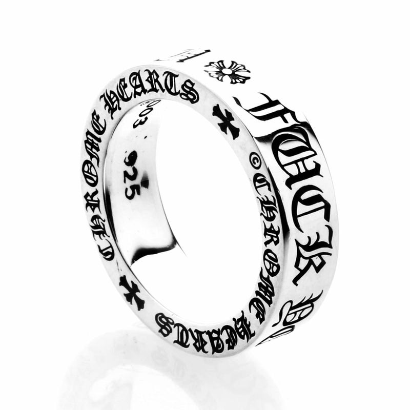 このリングはノーマル6mmスペーサーリングの側面にFuckyouと意味深い文字が彫られている。※リング側面の刻印デザインに関しましてこちらの商品のリング側面の刻印はリングサイズにより画像とデザインが異なる場合があります。