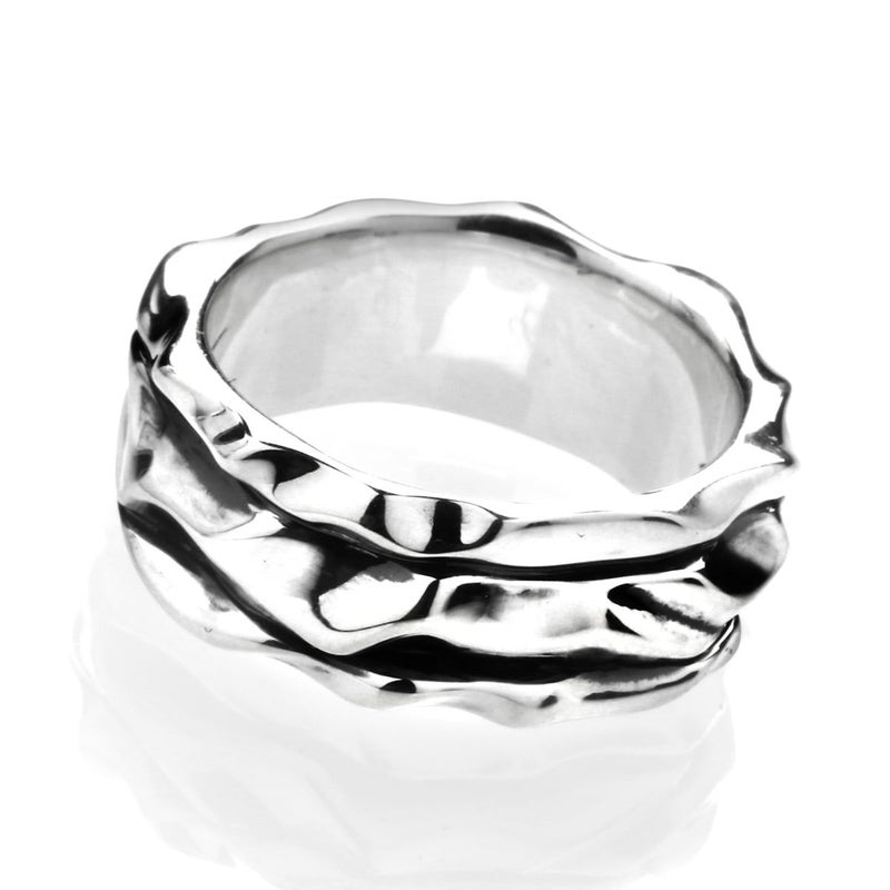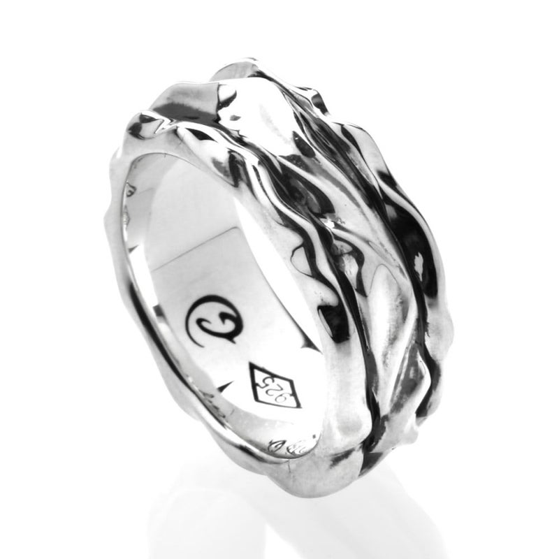 前も後ろも途切れる事無く、全面に大胆な鏡面が交差し多方面に光放つリング