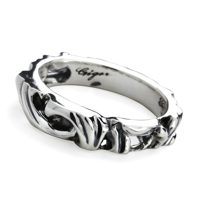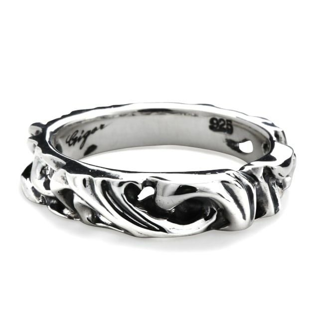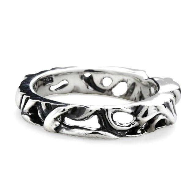 透かしレリーフの断面を鏡面出しを行う事により、上品に表現されたリング。
