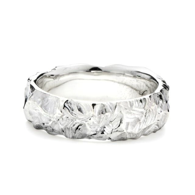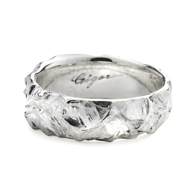 ヤジリに使われていた黒曜石の断面を割った時に金の石盤が現れたかのように表現したリング。