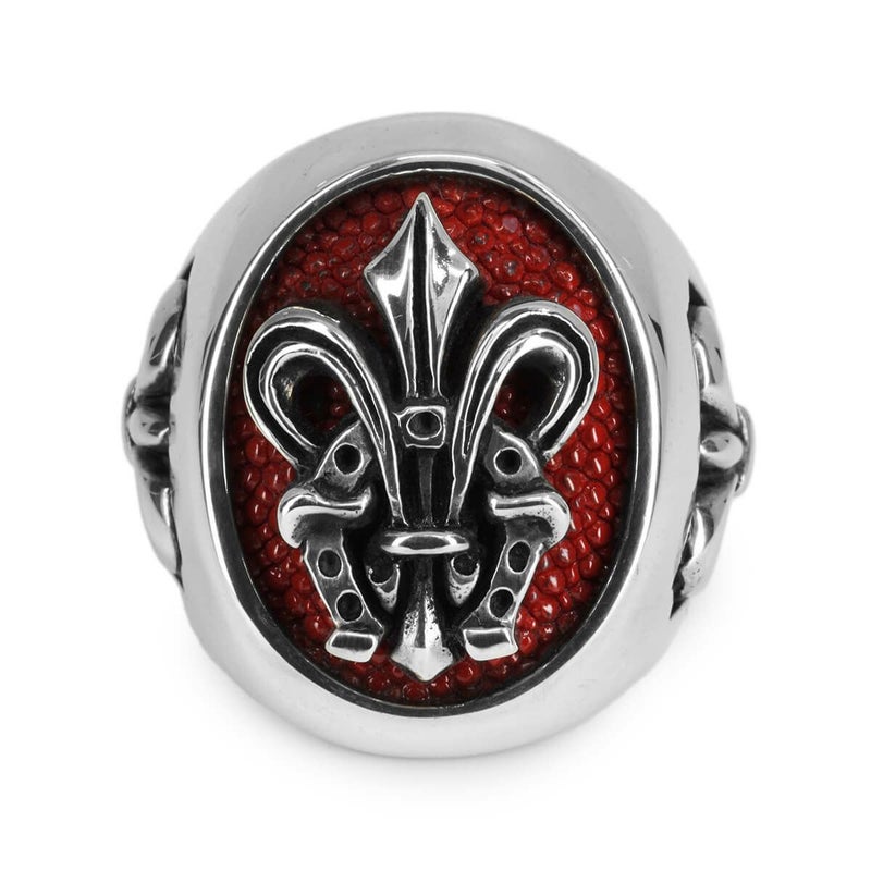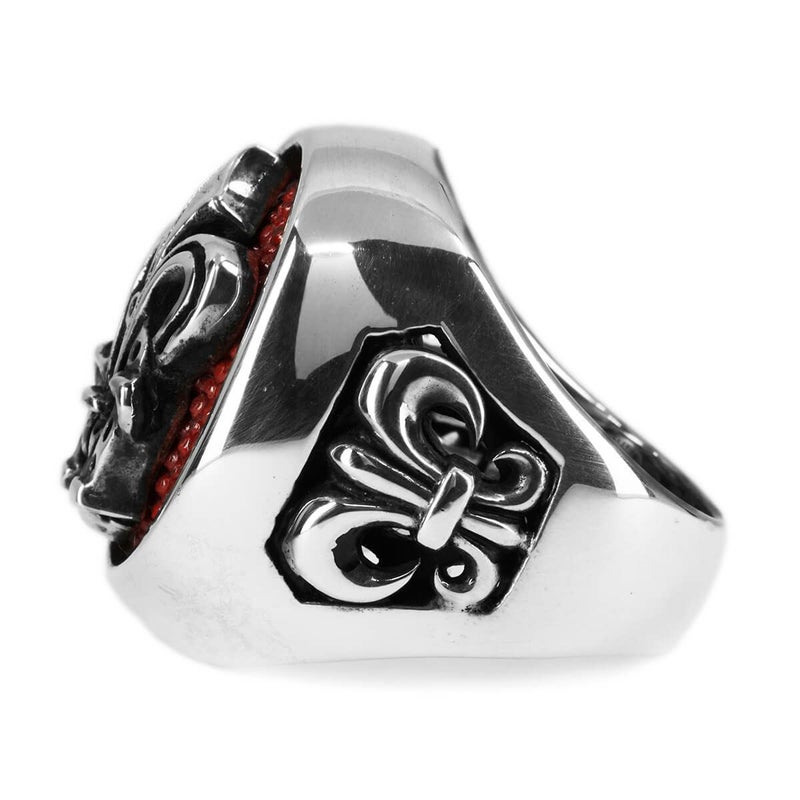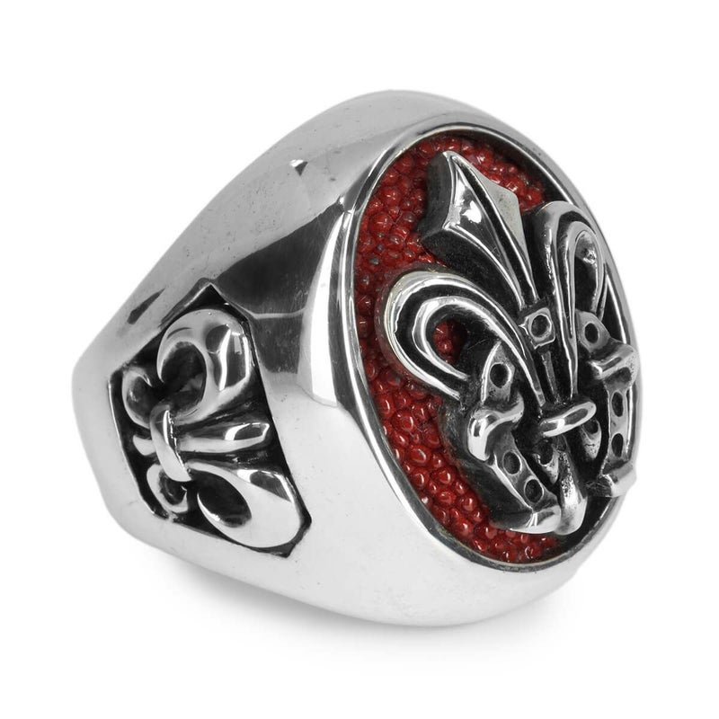 とある有名ミュージシャンの依頼で制作された、リングの中央にスティングレイレザーを組み合わせたブランドを代表するアイテムです。中央で存在感を放つ百合の紋章と馬蹄を組み合わせたモチーフは、気品のある優雅な雰囲気と華やかさをあわせ持っています。