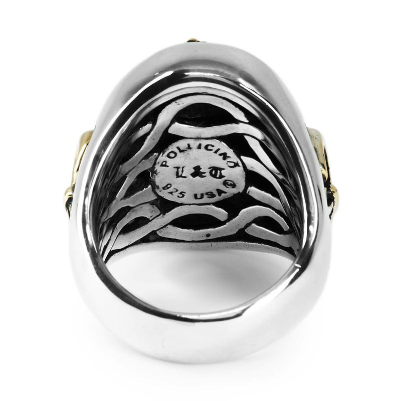 とある有名ミュージシャンの依頼で制作された、リングの中央にスティングレイレザーを組み合わせたブランドを代表するアイテムです。両サイドの百合を象ったデザインとメインモチーフのライオンがゴールド素材で作られており、より高級感と存在感を引き立たせたデザインとして仕上げられています。