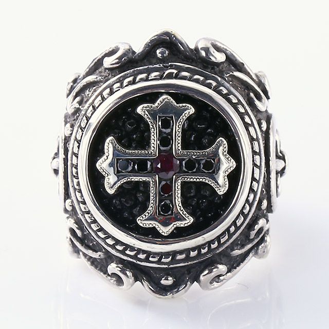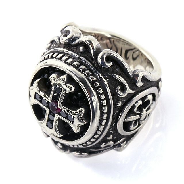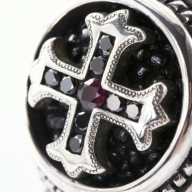 ラウンドベゼルスクロールインレイリング w/スパニッシュガレオンクロス w/ルビー(中央)/ブラックダイヤ(クロス部)