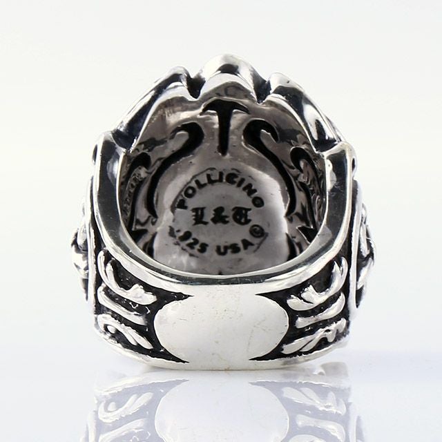 レザーズアンドトレジャーズ ラウンド ベゼル スクロール インレイ リング/スパニッシュ ガレオン クロス/ルビー&ブラックダイヤモンド