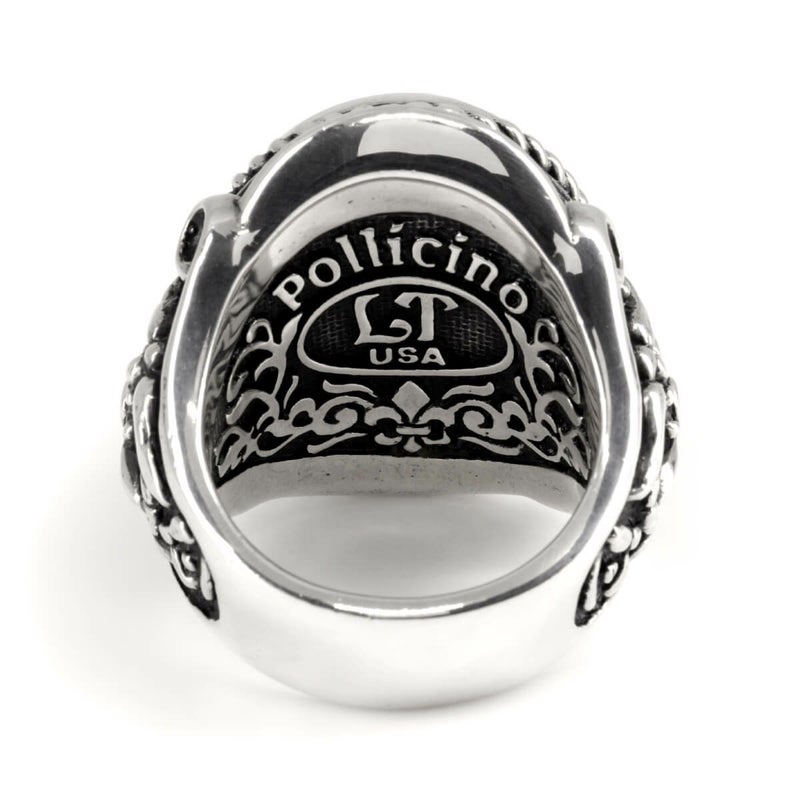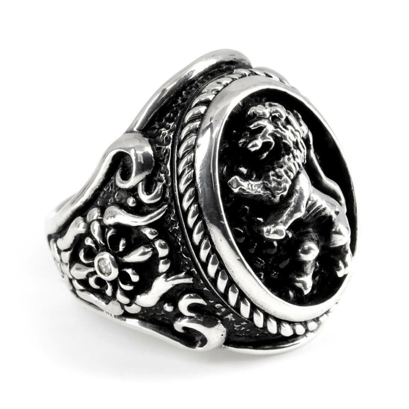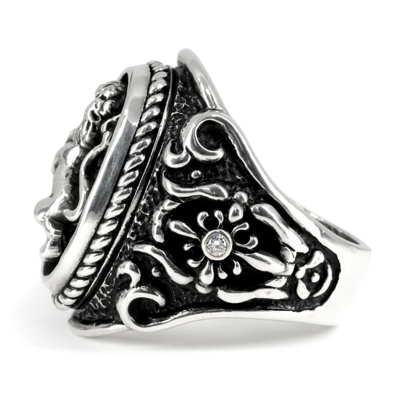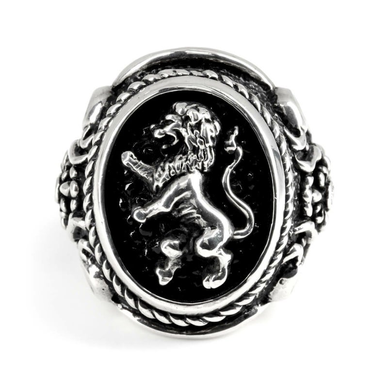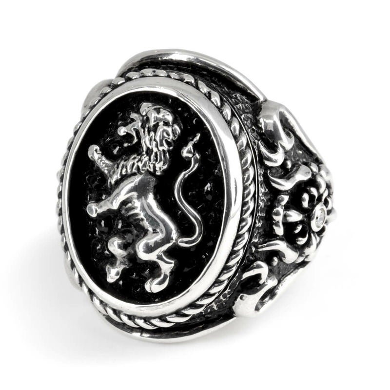 リング全体にスクロール文様の装飾を施した、主役級の存在感を楽しめるアイテムです。中央には力の象徴でもあるライオンの立ち姿を表したモチーフがはめ込まれています。