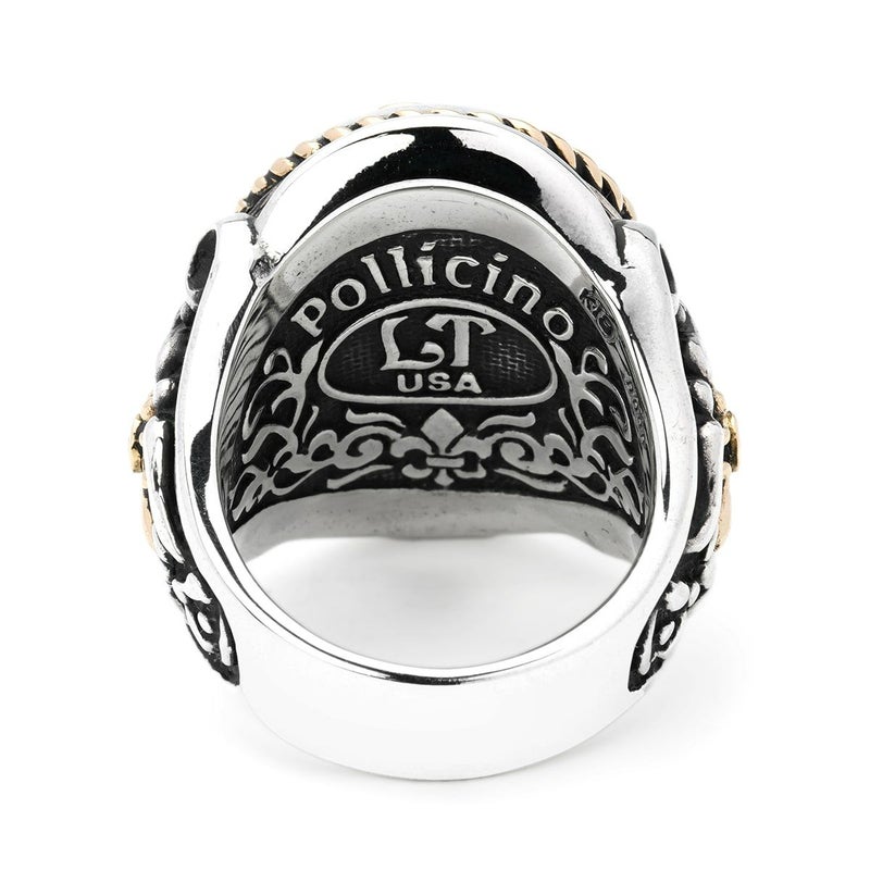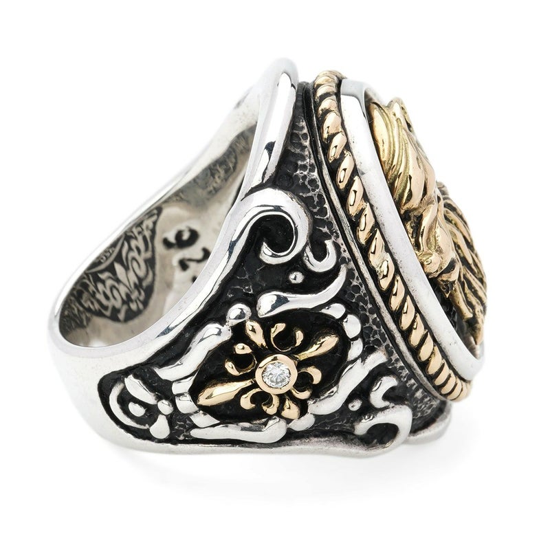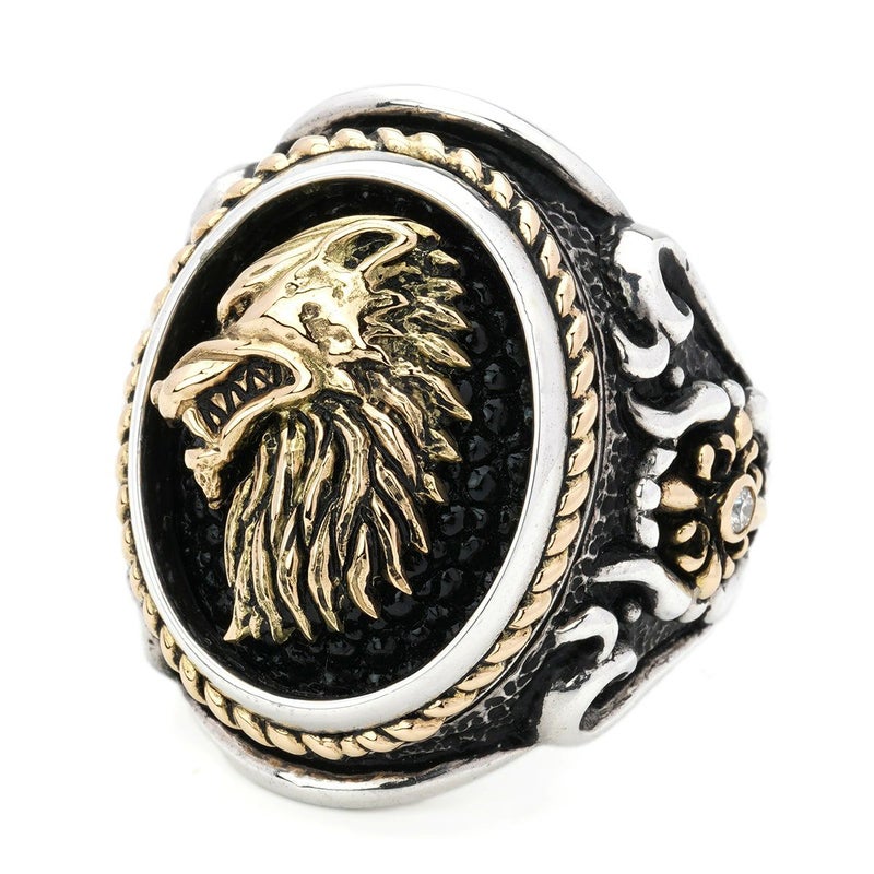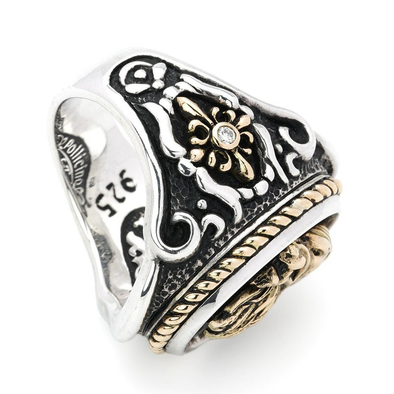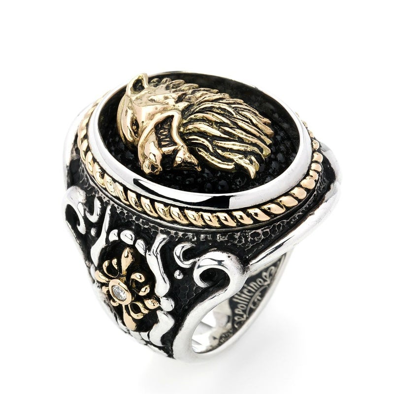 大振りのインレイ系リングの全体にスクロール文様の装飾を施した、主役級の存在感を楽しめるアイテムです。中央には対峙する相手を威嚇するかのような狼のモチーフがはめ込まれており、指先にアンティークジュエリーのような世界観を与えてくれます。