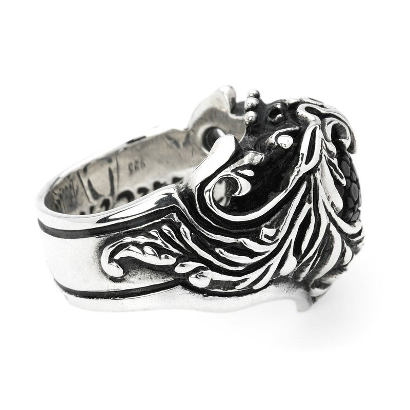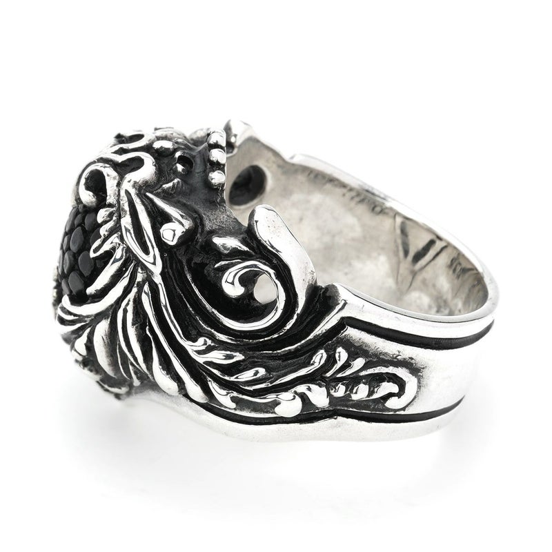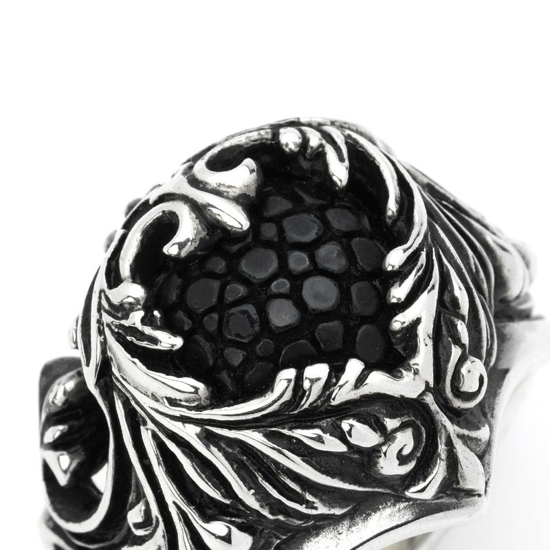 北欧に伝わる伝統的なスクロール柄で表現されたリングの中央に、スティングレイレザーを組み合わせたアイテム。その佇まいは、カラーにより全く異なる表情を見せてくれる。