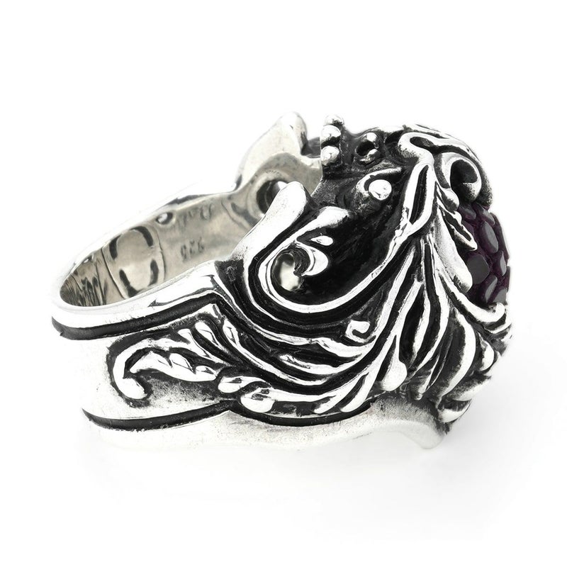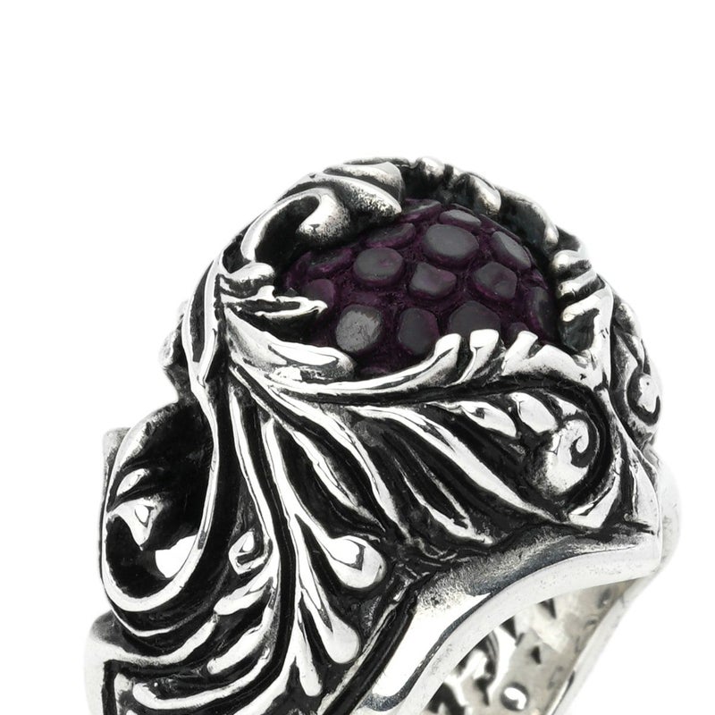 北欧に伝わる伝統的なスクロール柄で表現されたリングの中央に、スティングレイレザーを組み合わせたアイテム。その佇まいは、カラーにより全く異なる表情を見せてくれる。