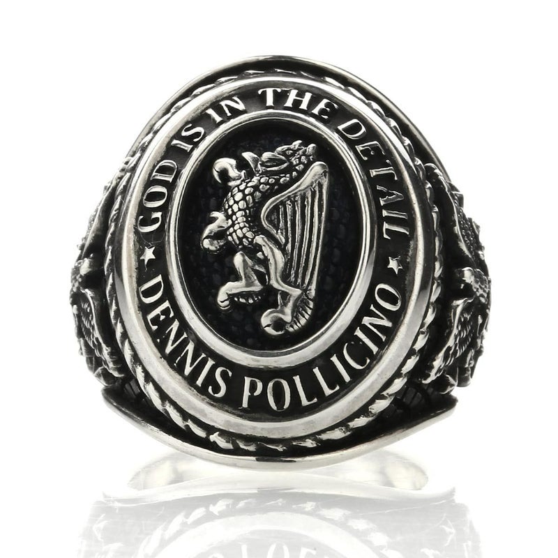 Leathers&Tresures創設者でありデザイナーのDennis Pllicino。かつて、アメリカ海軍に所属した経緯からUnited States Navyのイメージソースをカレッジリングに込めた彼の2周忌のメモリアルリングです。