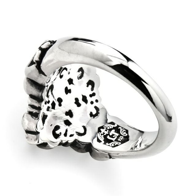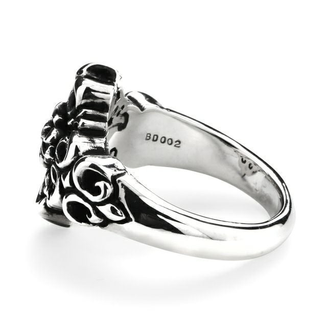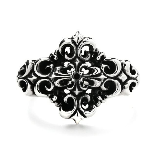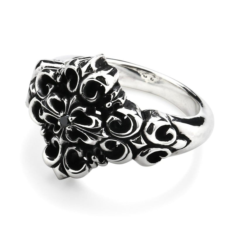 紋章として用いられる百合を四方に広がるようにデザインし、中央にブラックダイヤが留められたクロスを組み合わせたリング。さり気ないアクセントとして使いやすいボリューム感は、様々なコーディネートを楽しめる万能のアイテム。