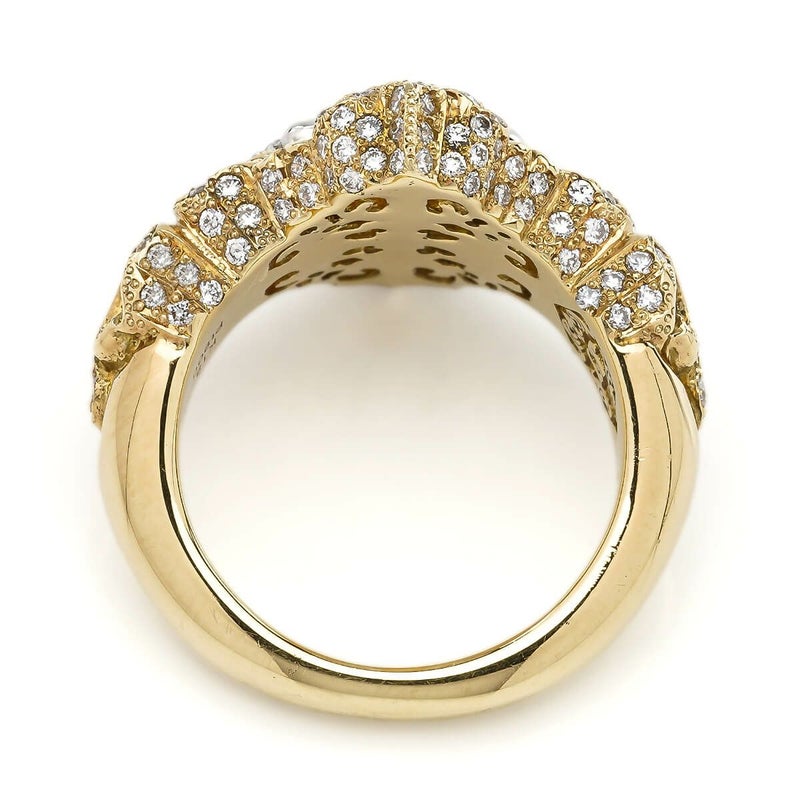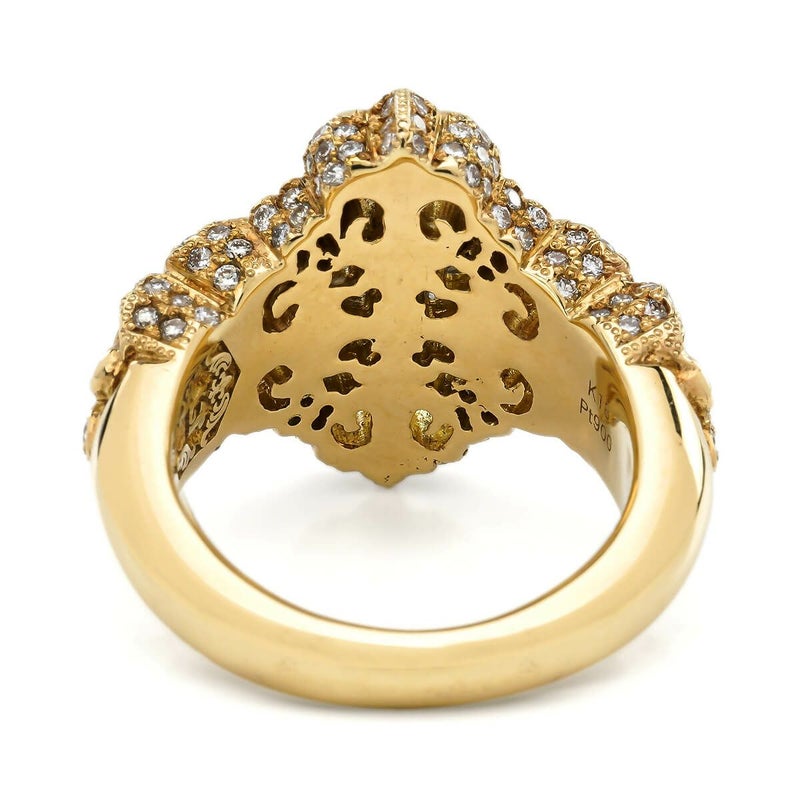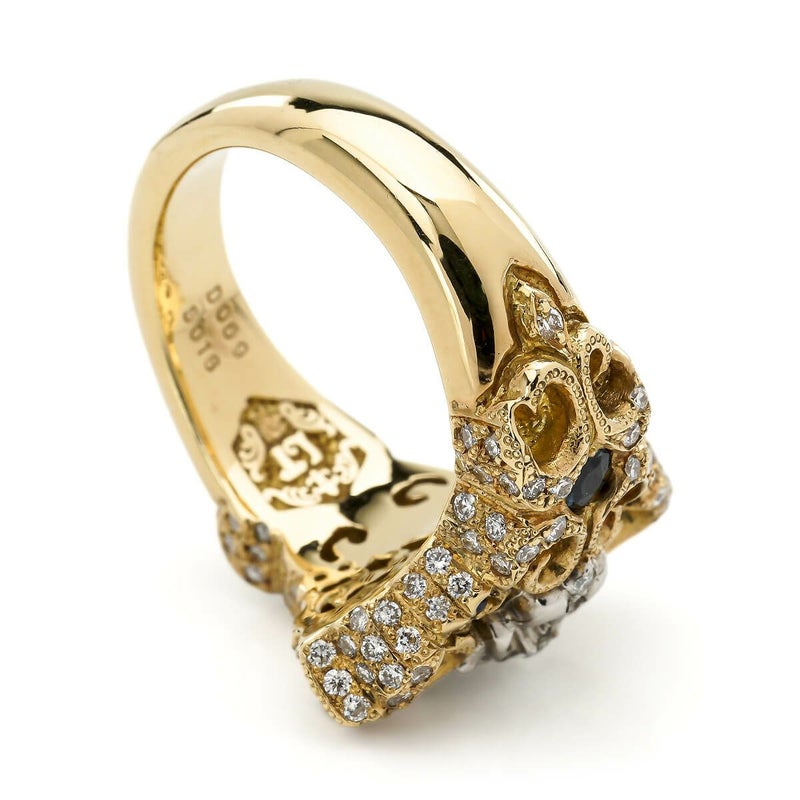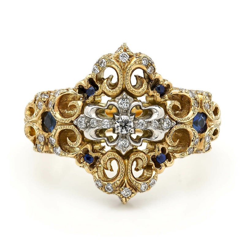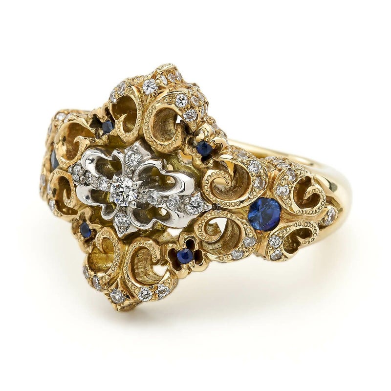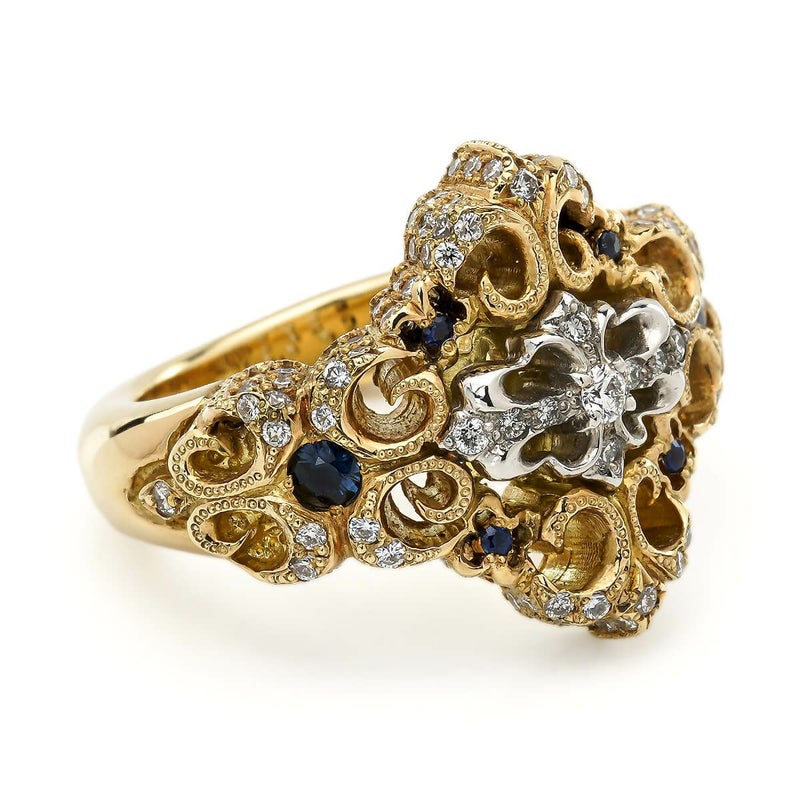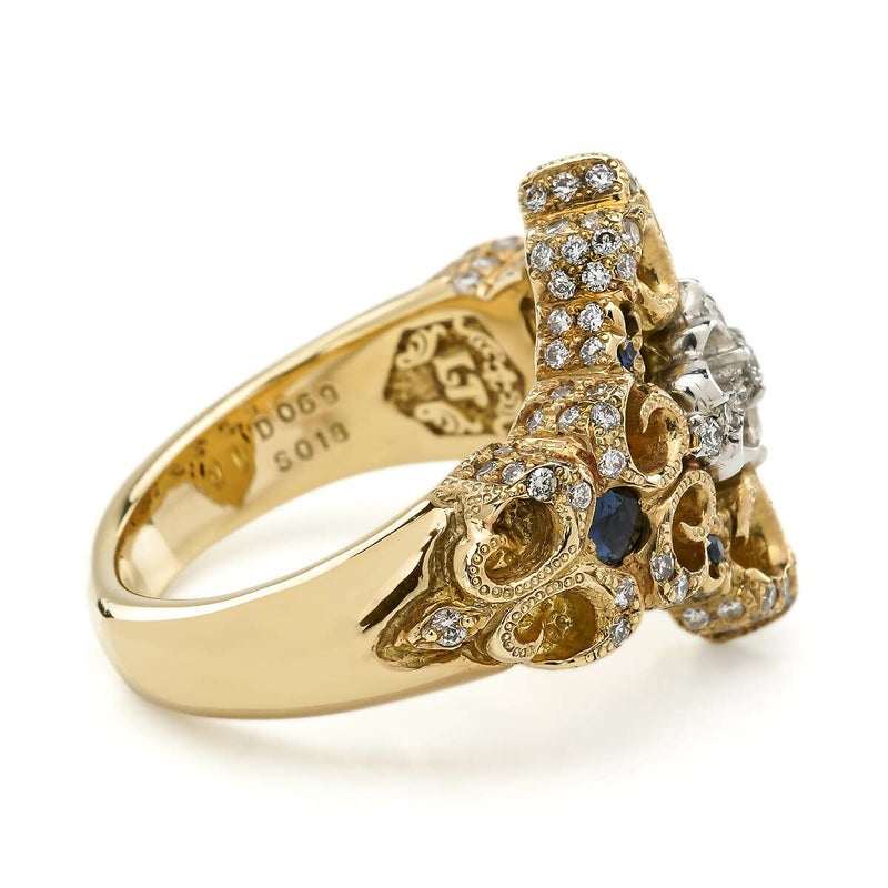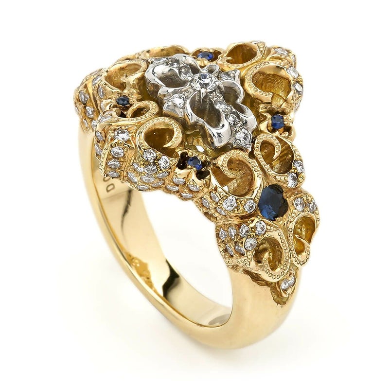四方に広がる百合紋章のデザインが印象的なリング。控えめながらも上品な存在感を放ち、どんなスタイルにも合わせやすい逸品です。中央に輝くクロスはプラチナ、リング部分はK18イエローゴールドで仕上げられ、129石のダイヤと6石のサファイアが絶妙なバランスで配置されています。贅沢な素材が織り成す、洗練された魅力を持つジュエリーです。