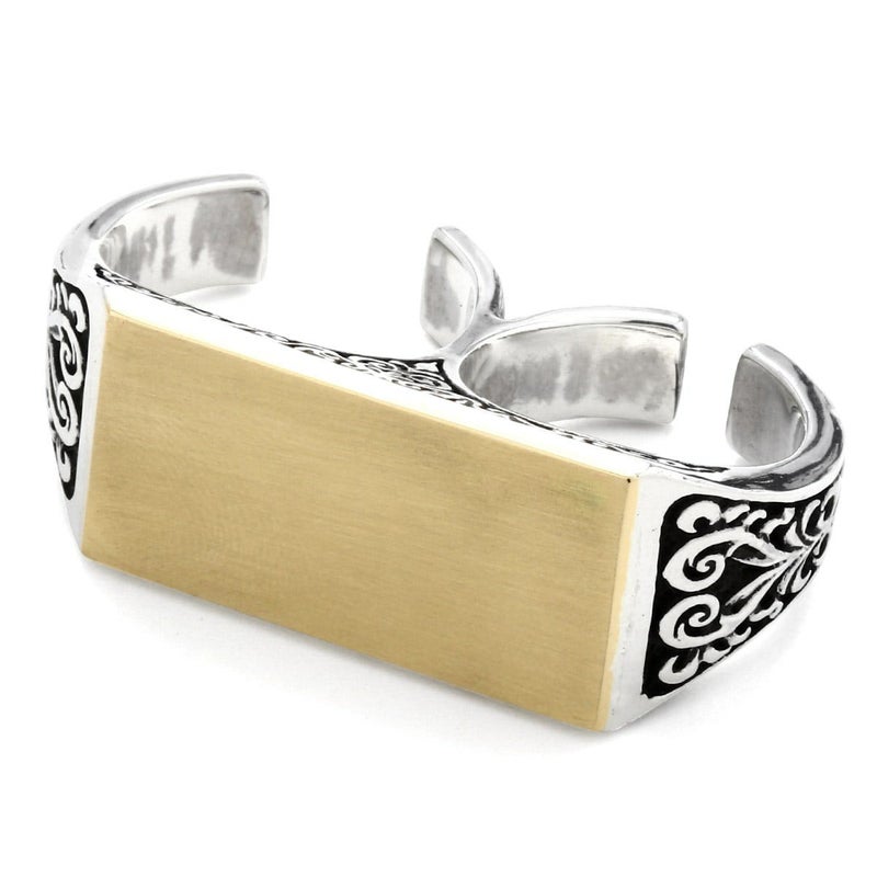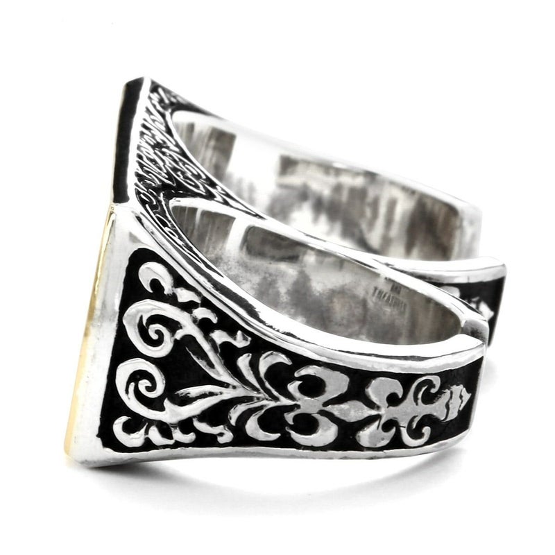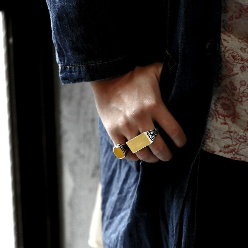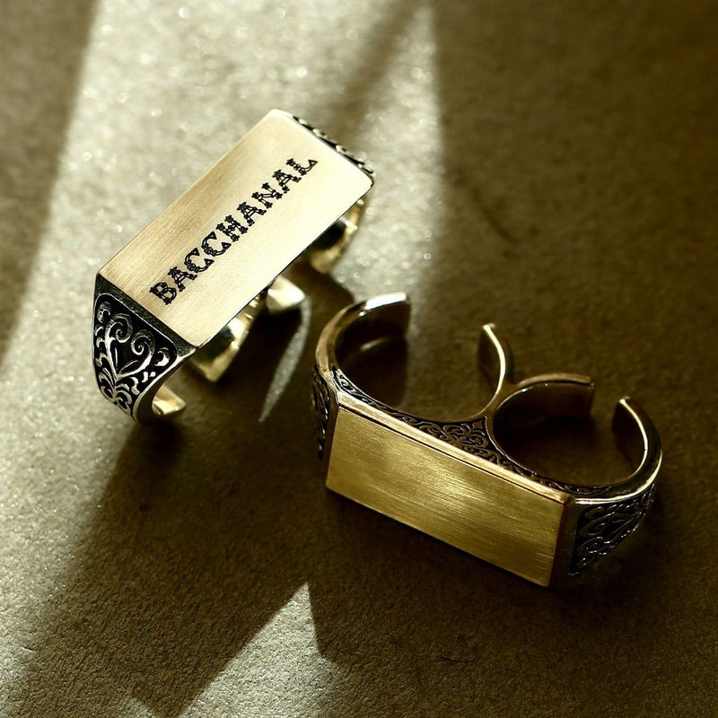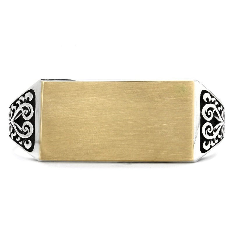 二本指型のリングでサイドにはヨーロッパ建築を思わせる植物の模様が刻まれ、トップはプレートが乗ったような無垢なデザインとなります。イメージとしてはIDブレスのプレート部分のようなイメージ。