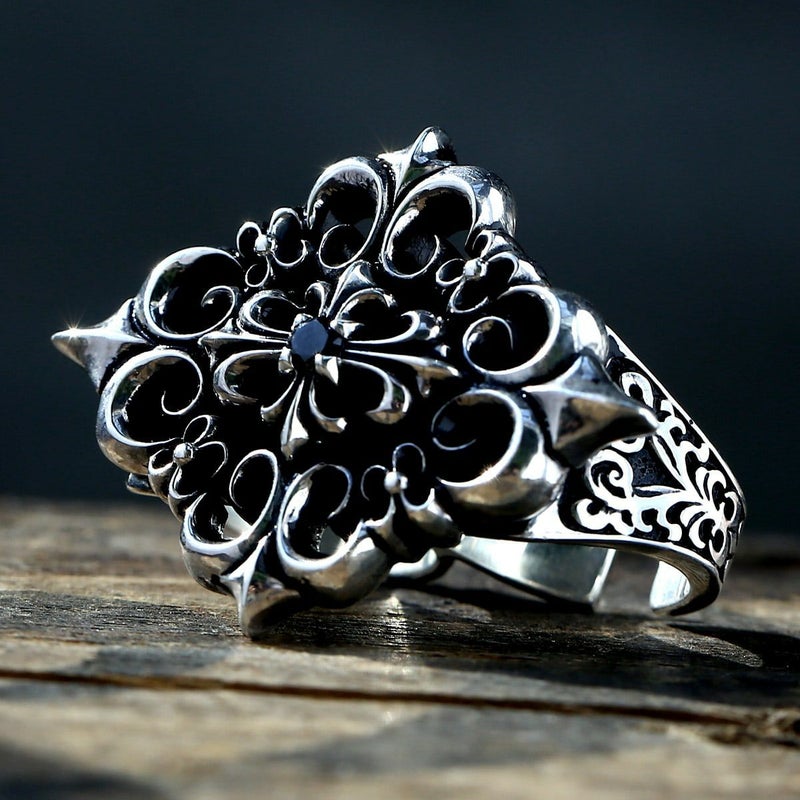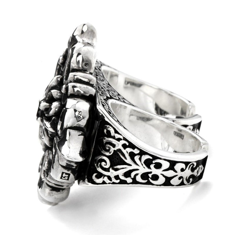 二本指型のリングでサイドにはヨーロッパ建築を思わせる植物の模様が刻まれ、トップにはペンダントパーツを設置した大胆なデザイン。