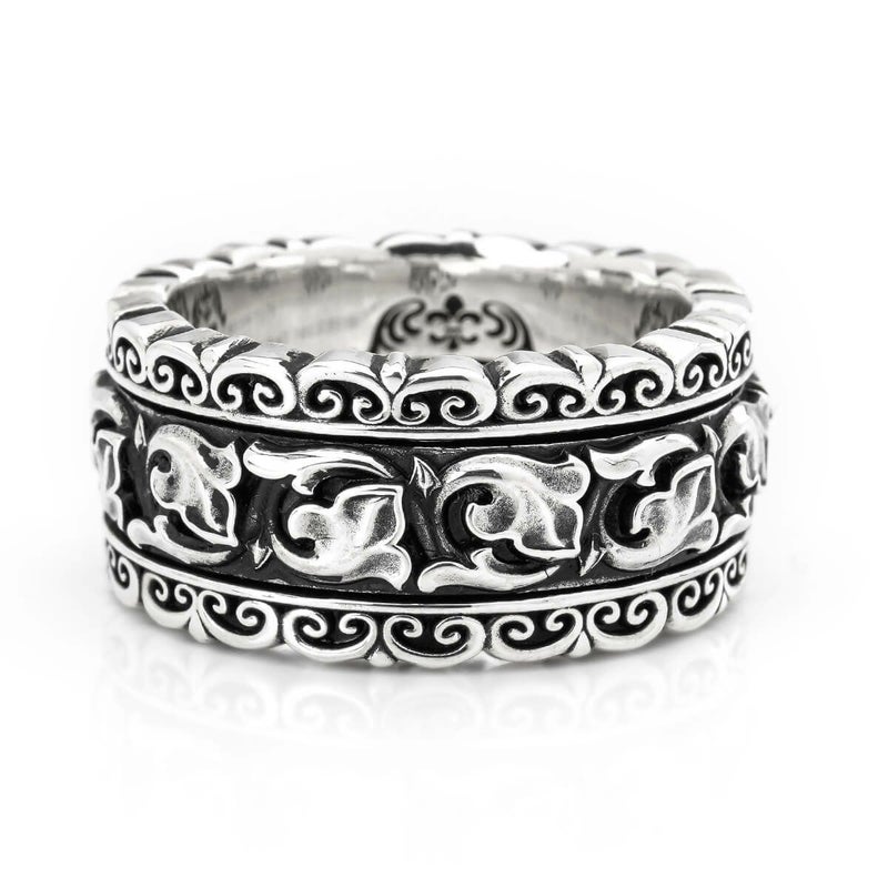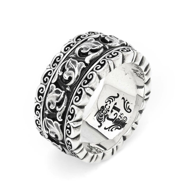 リングの上下に繊細な彫刻を施した、中央が回転するリボルビング技法で作られたリング。ベルト箇所には古くより伝わるフローラル柄を表現したデザインを組み合わせている。