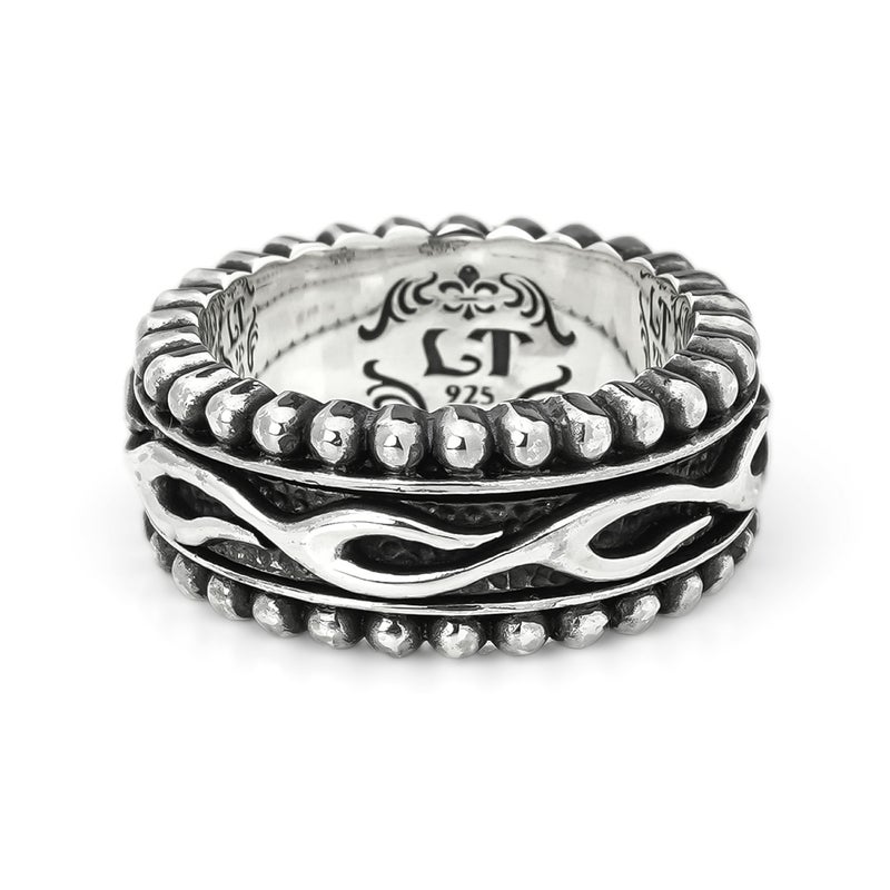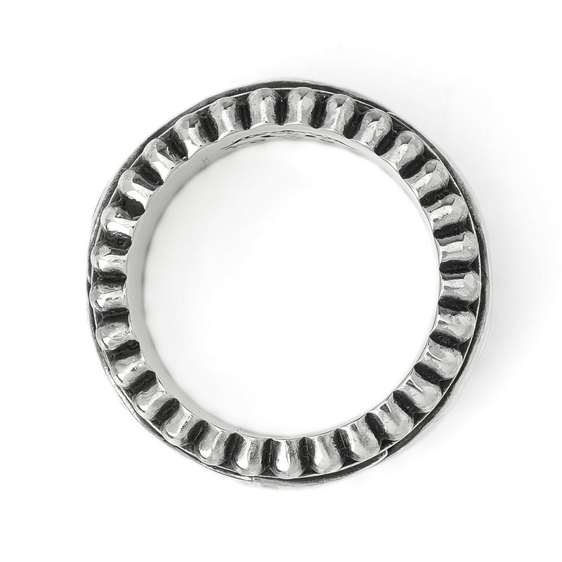 リングの上下にビーズ型の彫刻を施した、中央が回転するリボルビング技法で作られたリング。