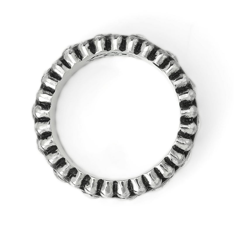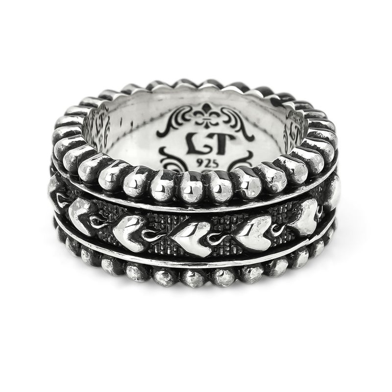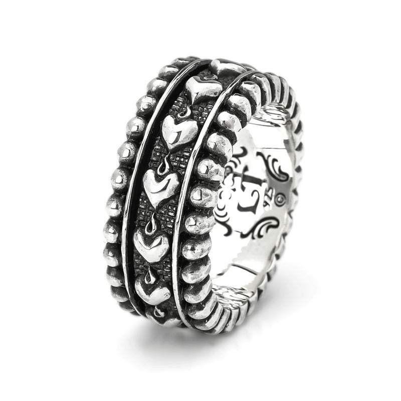 リングの上下にビーズ型の彫刻を施した、中央が回転するリボルビング技法で作られたリング。 細身の幅で表現したベルト箇所には、キリストの聖心を意味する炎の揺らめくハートをデザインしている。