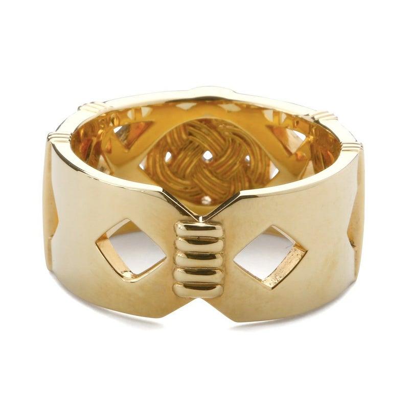 日本文化の伝統的な紐の結び方「水引」の1種、「梅結び」がモチーフ。ひもの両端を持って引っ張るとさらに固く結ばれることから「末永く途切れないお付き合い」という意味を持ちます。梅の花のように凛と華やかな結びで、花弁をもつその姿から人と人をつなぐという意味を連想し、絆や人脈、縁などを表しています。幅広なリングですがデザインの中に抜きがあるので軽やかな着け心地です。