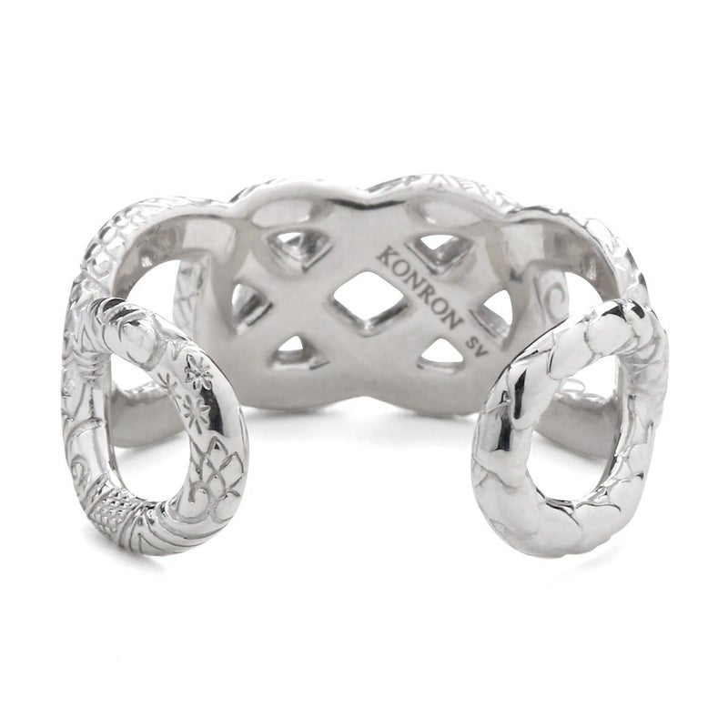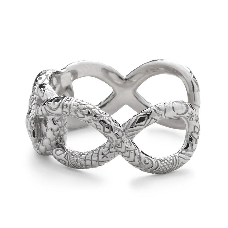 蛇は古来より、世界各国で「吉兆」「幸運」「永遠」の象徴とされてきた生き物で、ヨーロッパでも「永遠の愛」を意味します。恋人へのプレゼントとして婚約指輪のモチーフによく選ばれていたと言われています。このリングは2匹の異なったデザインの蛇が、絡み合うように1つになった姿がデザインされています。リングの縦幅が9?@と幅広なので、メンズでもご着用頂けます。シルバーとゴールドカラーの2色展開がございます。