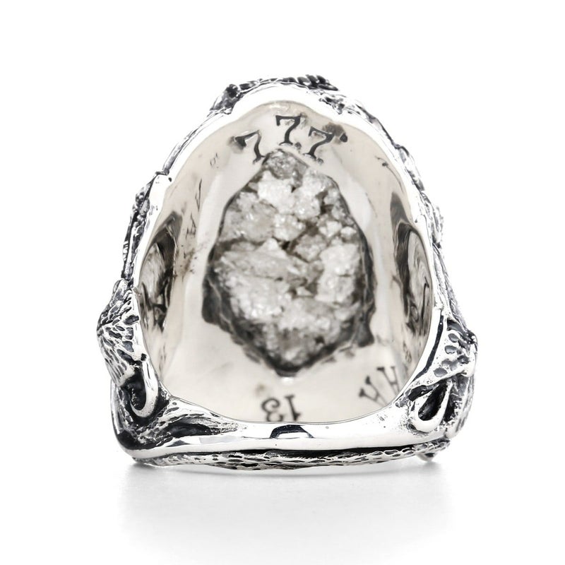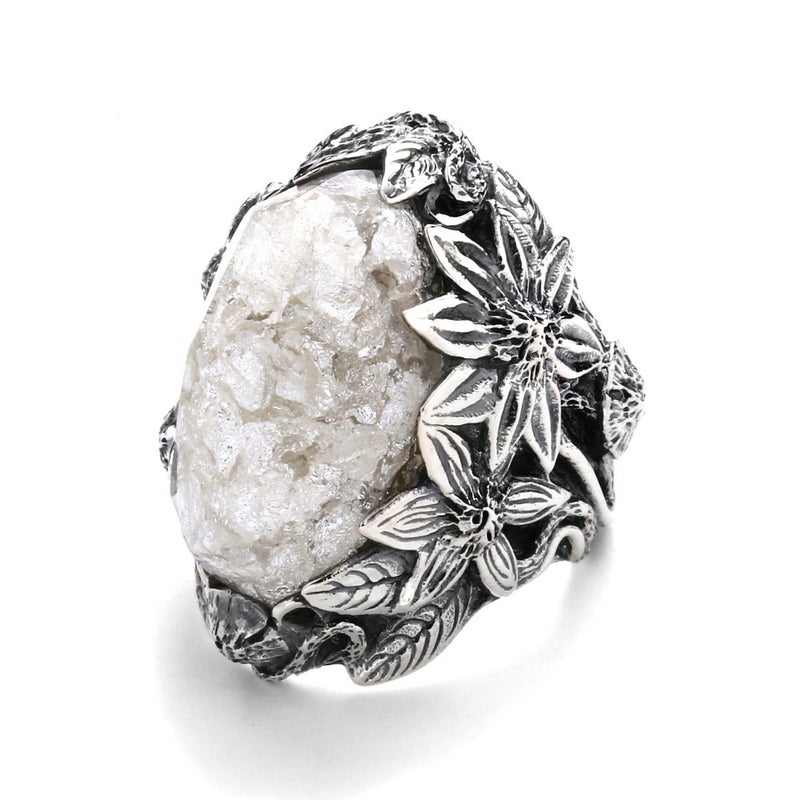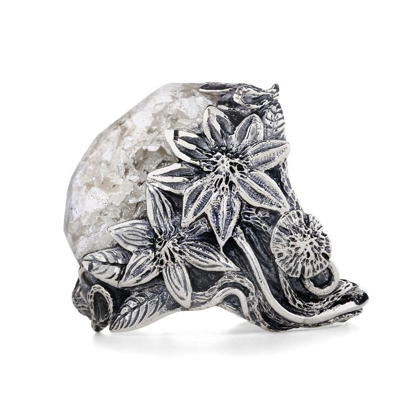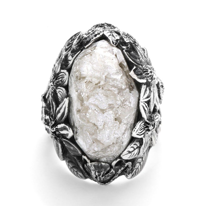 特殊な製法で生成されたストーンの中に白金箔を散りばめた豪華なリング。ストーンを囲む重厚感あるシルバーの枠には蝶や花などが落とし込まれている。