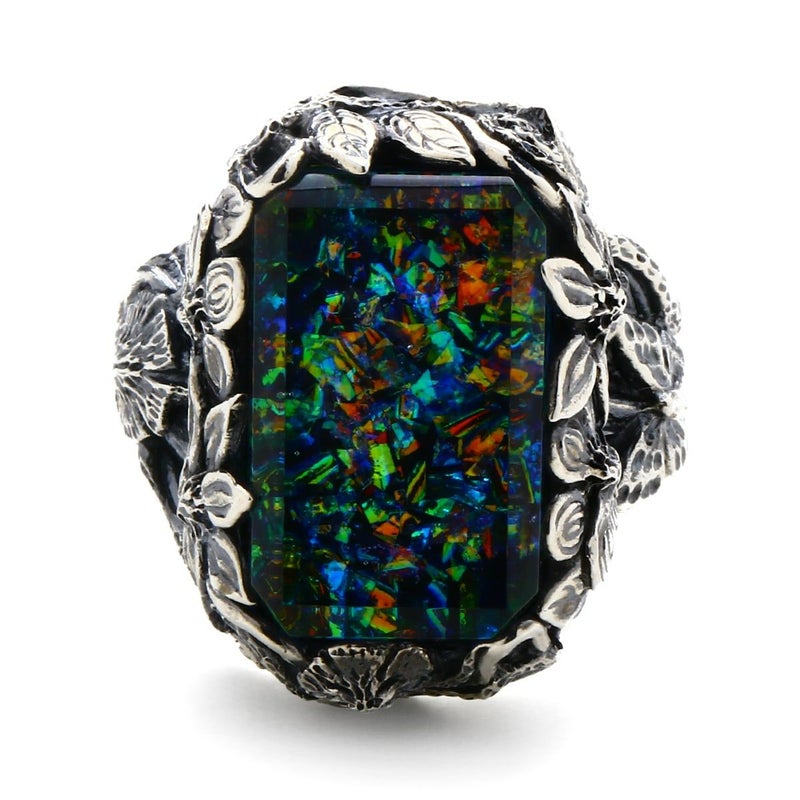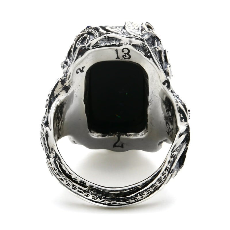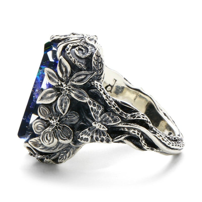 ストーンを囲む重厚感あるシルバーの枠には蝶や花などが落とし込まれており、ホログラム素材を散りばめた特別な 製法で創られたブラックベースの多様な輝き方をするカラーストーン。広大な宇宙と数えきれない程に存在す る星を石の中に閉じ込めたようなイメージでデザイン。見る角度によって色彩、表情が変化し天然石にしか創 り出すことができないラブラドライトを混ぜることにより煌びやかでより一層、神秘的な雰囲気を演出。1点1点 手作業による製作のため、ふたつと同じものは存在しないのも魅力的。