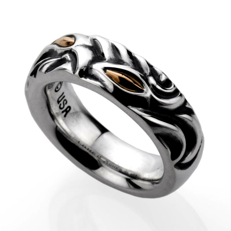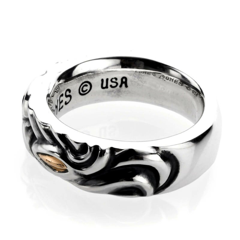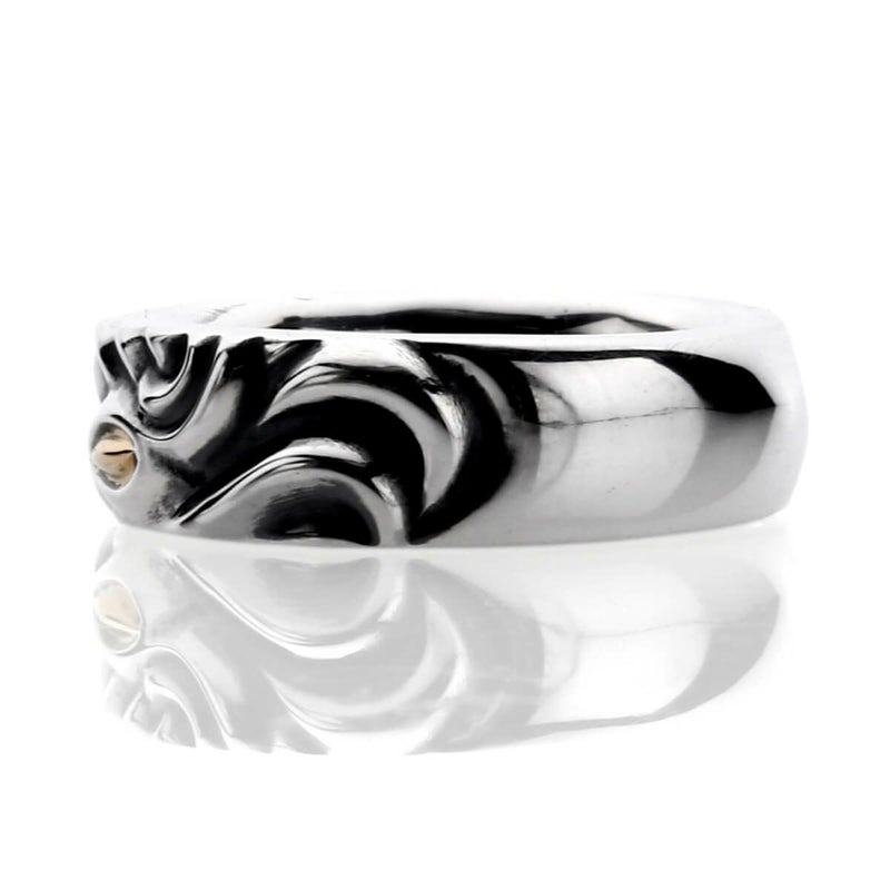 ラブバイトとはキスマークの意味であり、情熱の印を2羽の鳥で表現した作品。美しく流れる様なデザインは、情熱的なコンセプトとは対照的で柔らかい雰囲気の作品に仕上げている。男性・女性共に着用しやすいのでペアリングとしても最適。部分ゴールドを施しよりデザインを浮き立たせた作品。