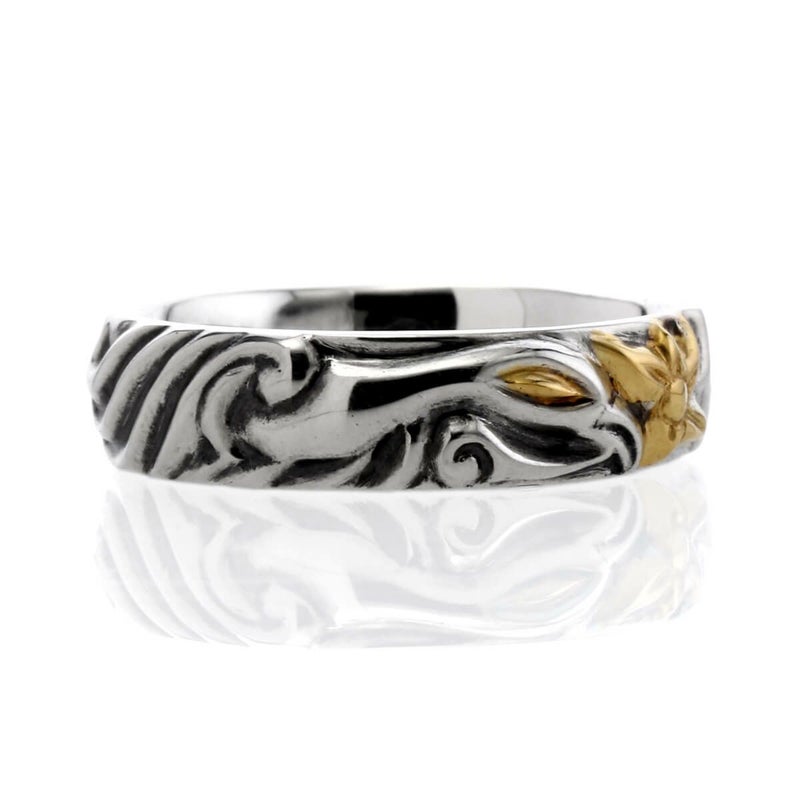 ソウルメイトとは「魂」と「仲間」を組み合わせた造語で、生まれる前から出会う事が決まっていた相手の事。強い絆で結ばれる様を2羽の鳥のデザインで表現したリング。ポイントでゴールドを施す事でよりデザインが浮き立つ作品。